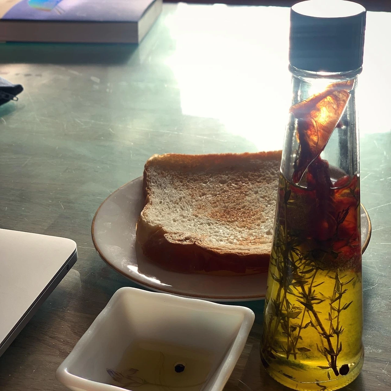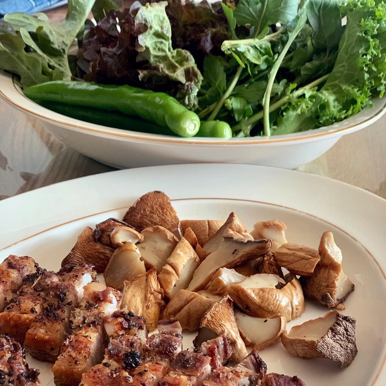 #소뿔농장 꾸러미 속 작은 즐거움. 허브오일 맛이 궁금한 상태로, 정신 없이 세월 보내다가 오늘은 드디어 아침에 빵을 토스트했어요. 풍미란건 이런거죠. 향히 강하지 않은데도 부드럽게 감싸주는 맛. 오늘은 쌈야채 싱싱할 때 마저 해치우겠다고, 삼겹살과 버섯을 통으로 구워서 차려냈어요. 며칠 전 닭다리살 구이에는 샐러드로 곁들였죠.