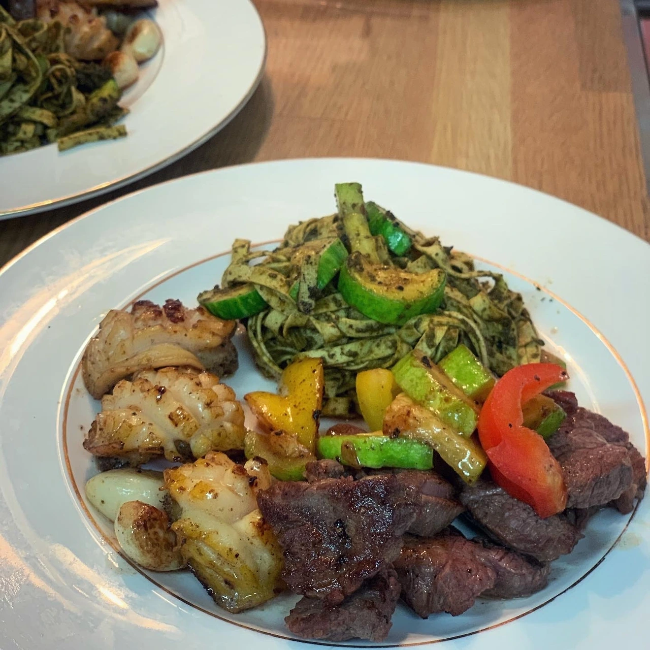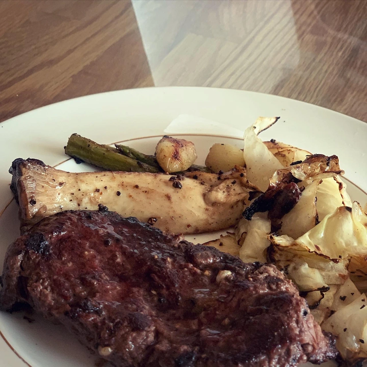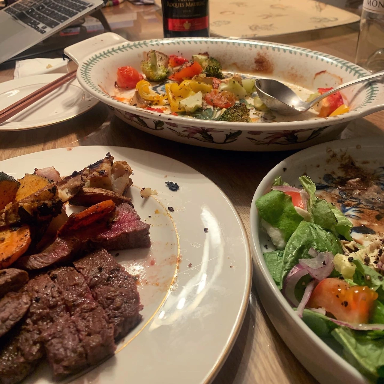 먹다가 중간에 찍다니. 스테이크와 야채. C님과 둘이. 나중에 옆지기 합류해 셋이 와인 네 병..