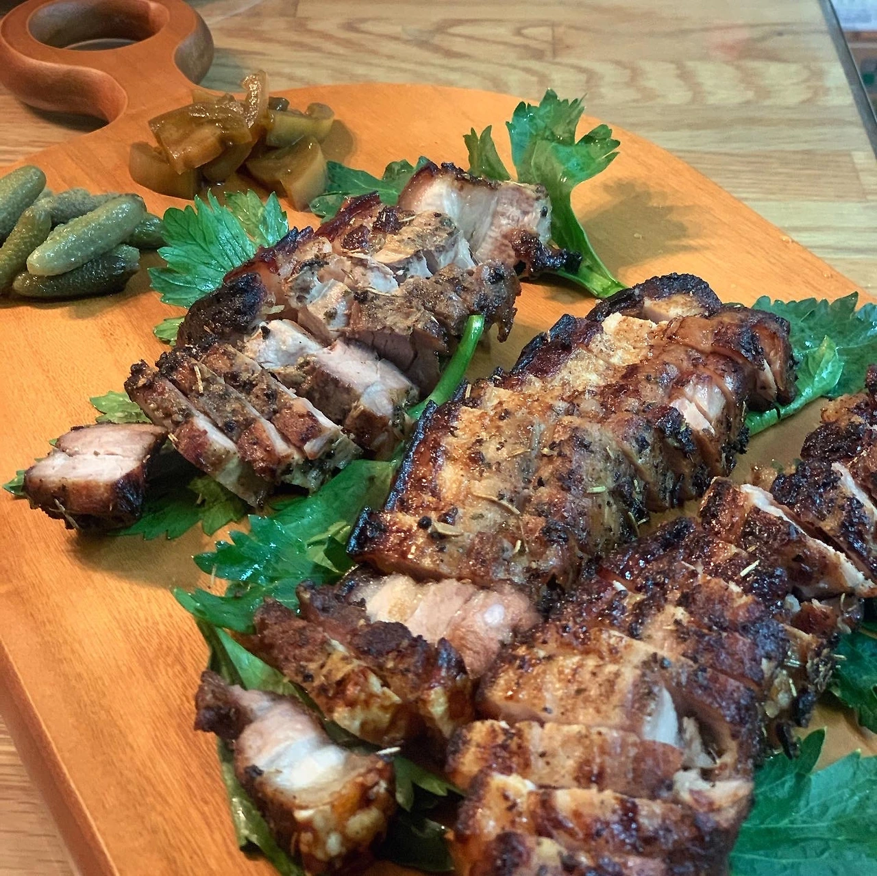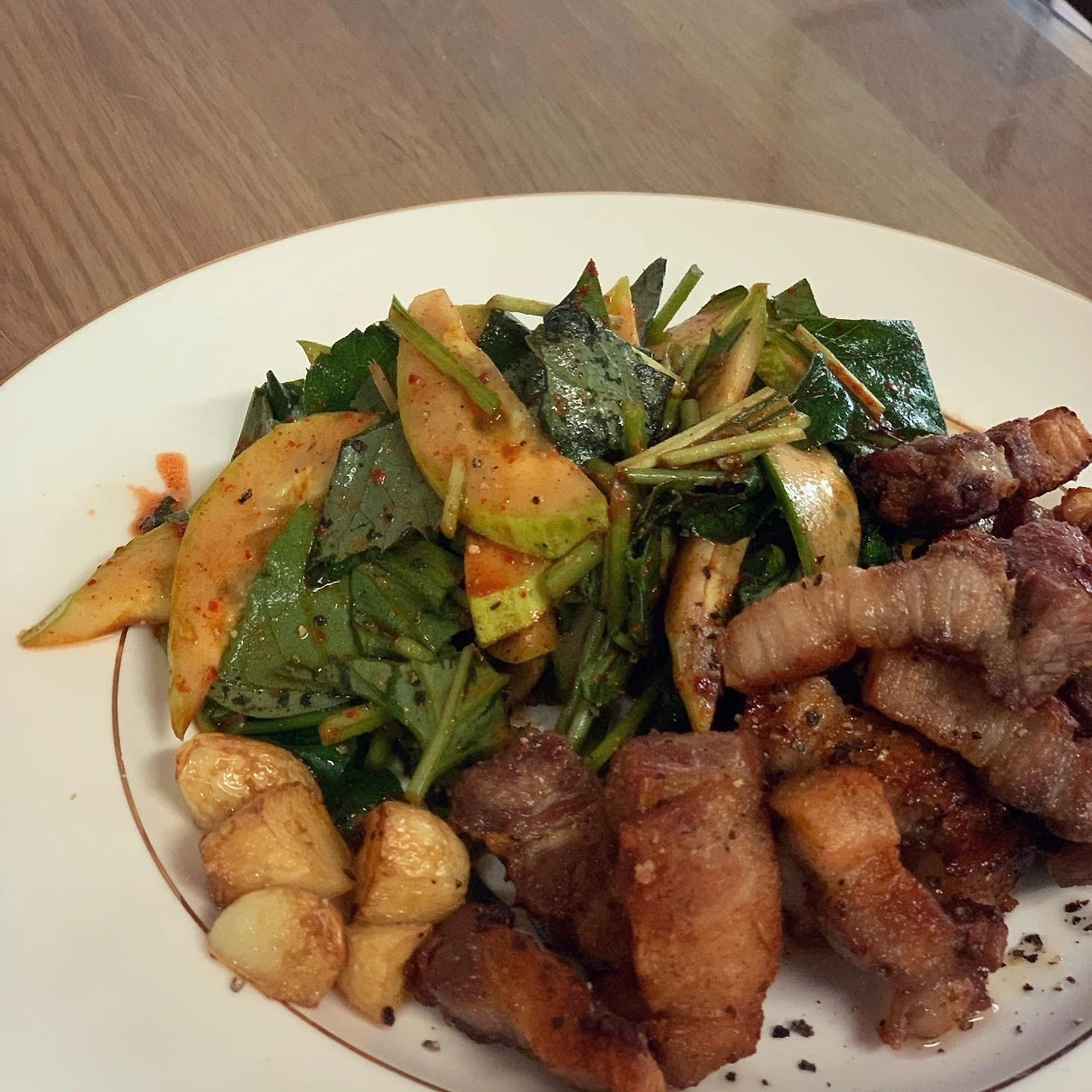 고기와 야채만으로 때웠다고 말하기엔, 내가 구웠지만 정말 잘된 삼겹살..