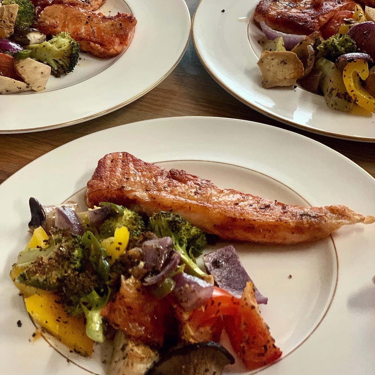 연어와 구운 야채. 돼지와 찐 야채. 사실 손 거의 안가는 단순 요리로