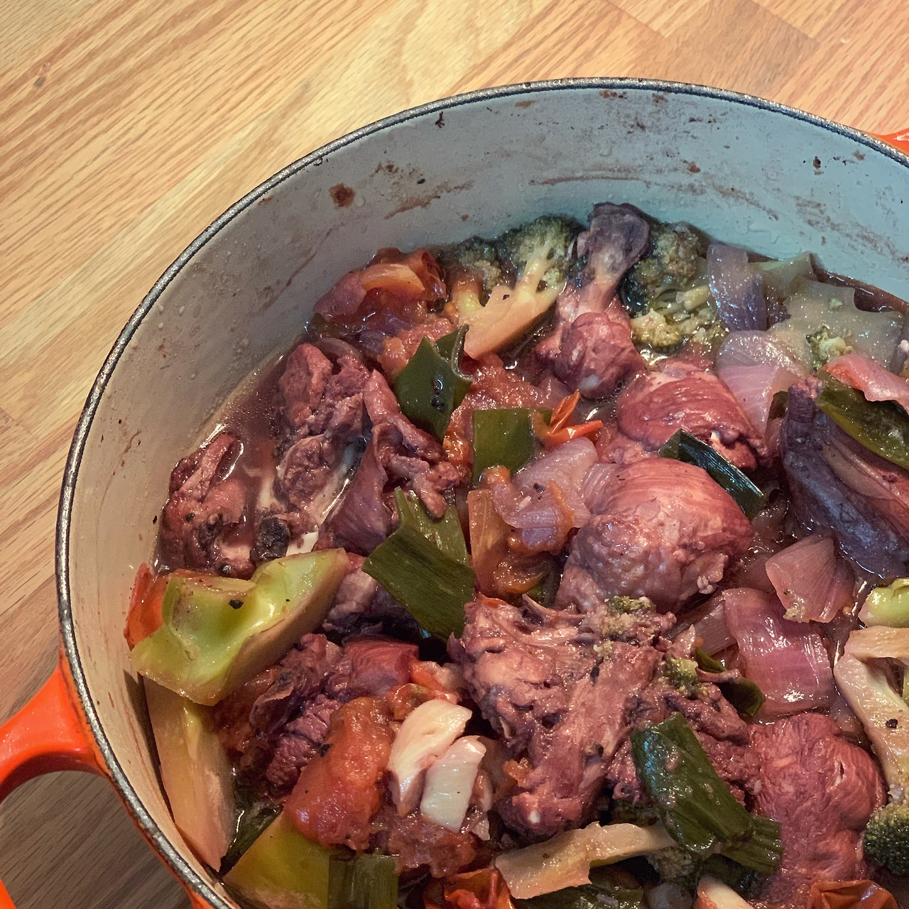 부엌 구석에 3분의1 쯤 남은 와인을 못치우다가.. 냄비에 콸콸 붓고 닭 양파 토마토 브로콜리 파마늘 다 때려넣고 소금후추 간해서 뭉근하게 약불에 1시간. 꼬꼬뱅 흉내를 낸 닭야채찜 느낌. 맛은 말해 뭐해요. #마냐밥상