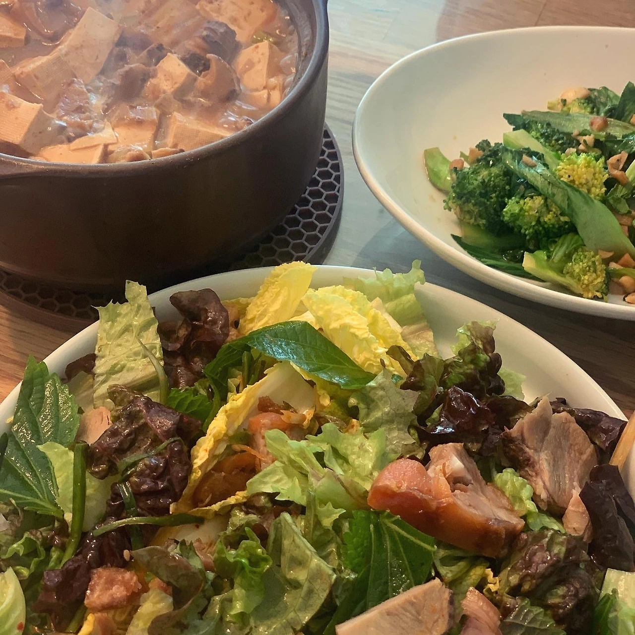토종닭 기름 떼고 파마늘 소금후추, 한 시간 푹 끓이기만 하면 알아서 맛있는.. #마냐밥상. 상추 씻어 양념하고, 마늘과 청경채 조선간장에 휘릭 볶는데 각 3분 정도 걸린듯요. 보이는 것보다는 수고 최소화.. 옆지기와 둘이 평일 저녁 먹는건 코로나 2차 대유행 이후 처음인듯요. 서로 나눌 얘기가 꽤 있더군요.