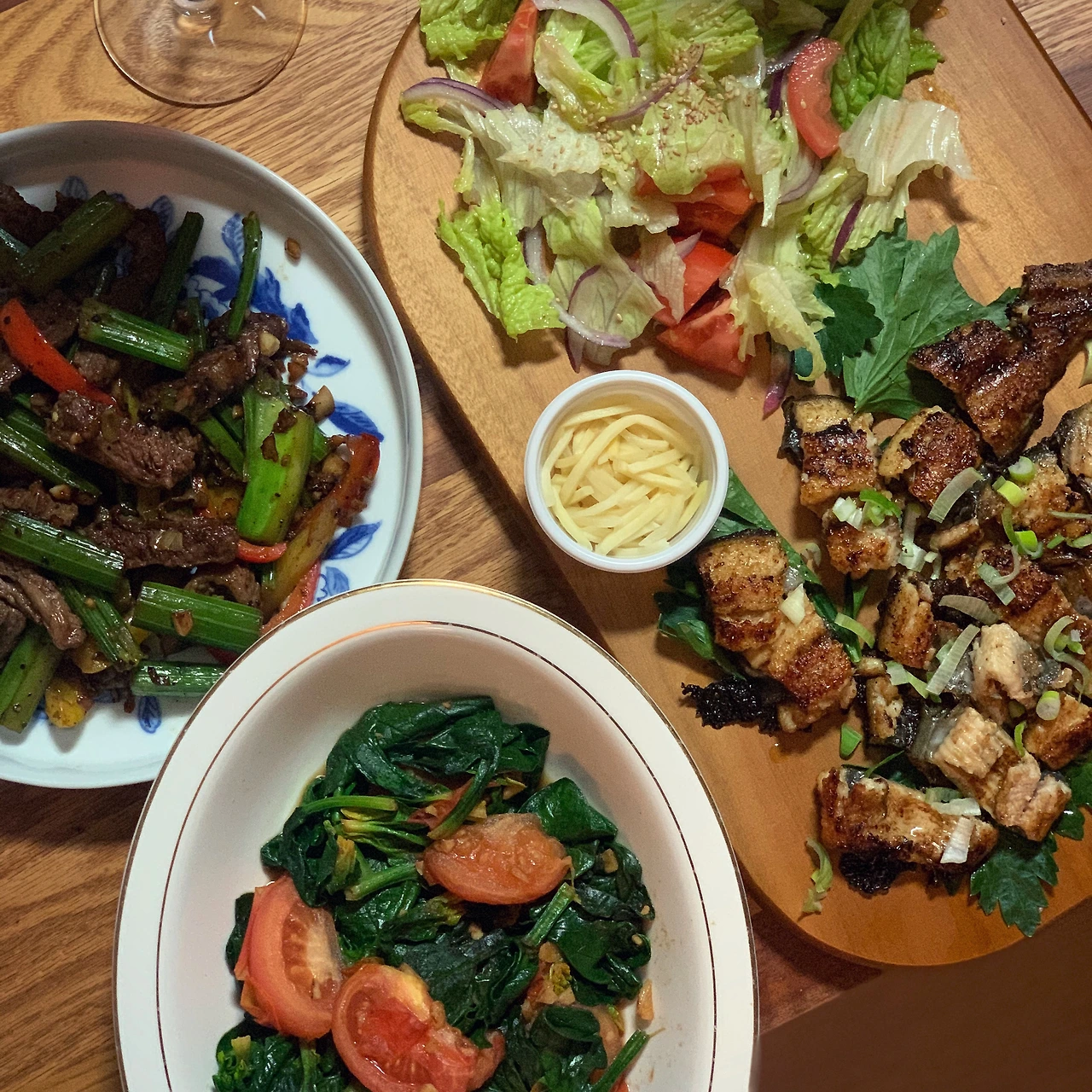 마늘과 토마토를 들기름에 볶다가 시금치 넣고 긴장 한 숟가락 휘적휘적. 파 쇠고기 샐러리 마늘 파프리카 순으로 소금후추굴소스 휘리릭.인친 인기템인 오가네장어 초벌 구워 배송되니 그냥 구우면 끝. 메리크리스마스 #마냐밥상 다정한 이들과 평온한 시간 보내세요.