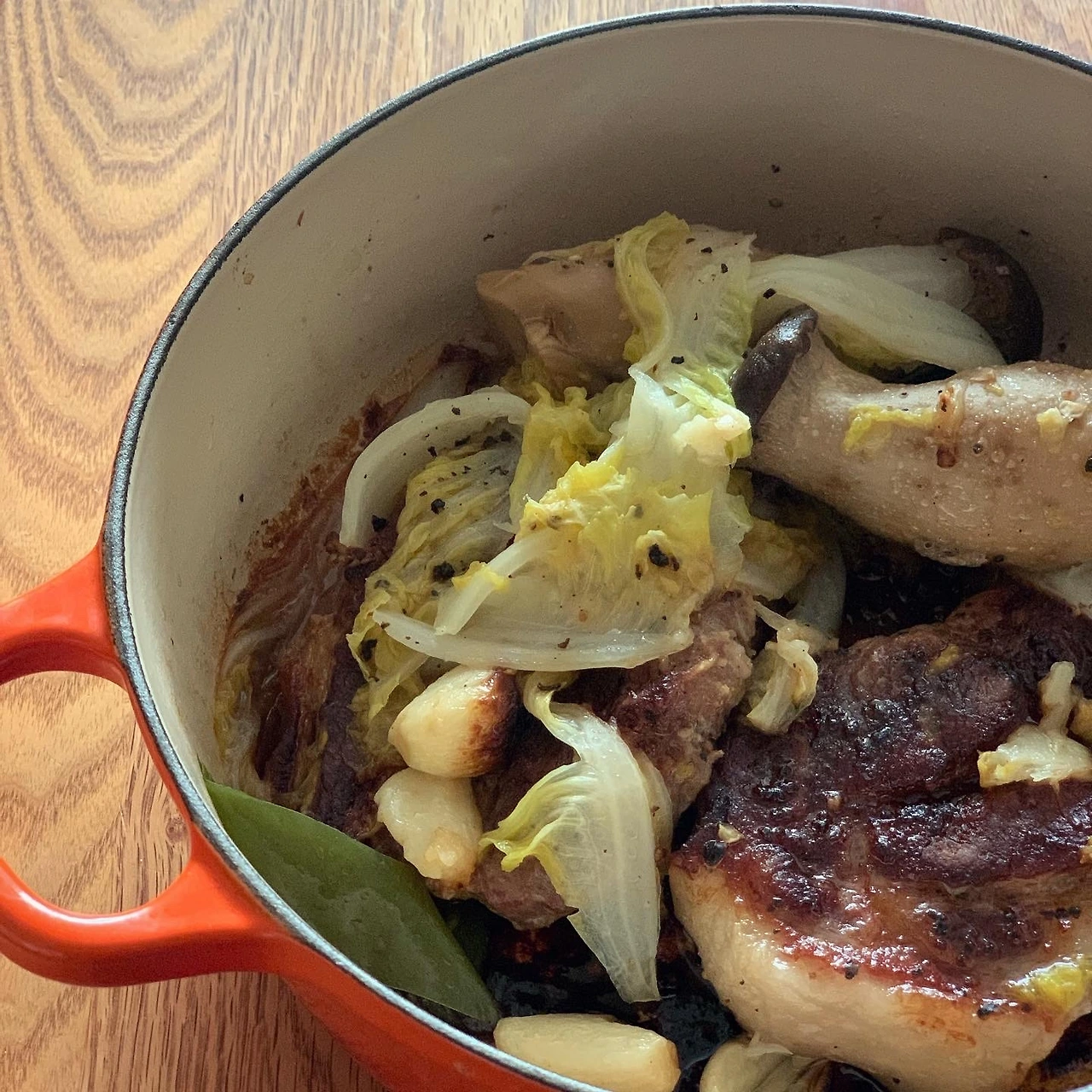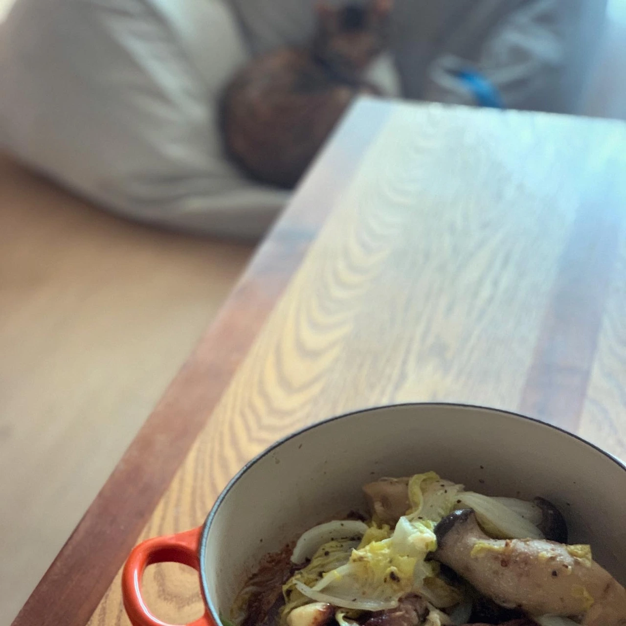 사진 찍으려는데 멀리, 엄마의 빈백 의자를 차지해버린 요미. 무튼 주말마다 놀러다니는 남편은 열외. 딸까지 나간다고 해서 늘어진 일요일 오전. 11시에 "엄마, 점심은 먹고 나갈거야"라고 하는 바람에.. 허겁지겁 냉동실의 돼지 목살을 꺼내고. 올리브오일 휘두른 무쇠 냄비에 넣어 아주 약한 불에 1시간. 버섯은 첨부터 같이. 배추와 고추 마늘 등 온갖 야채는 중반 이후에 추가. 양념은 허브소금후추. 손은 많이 안 가는 요리죠...