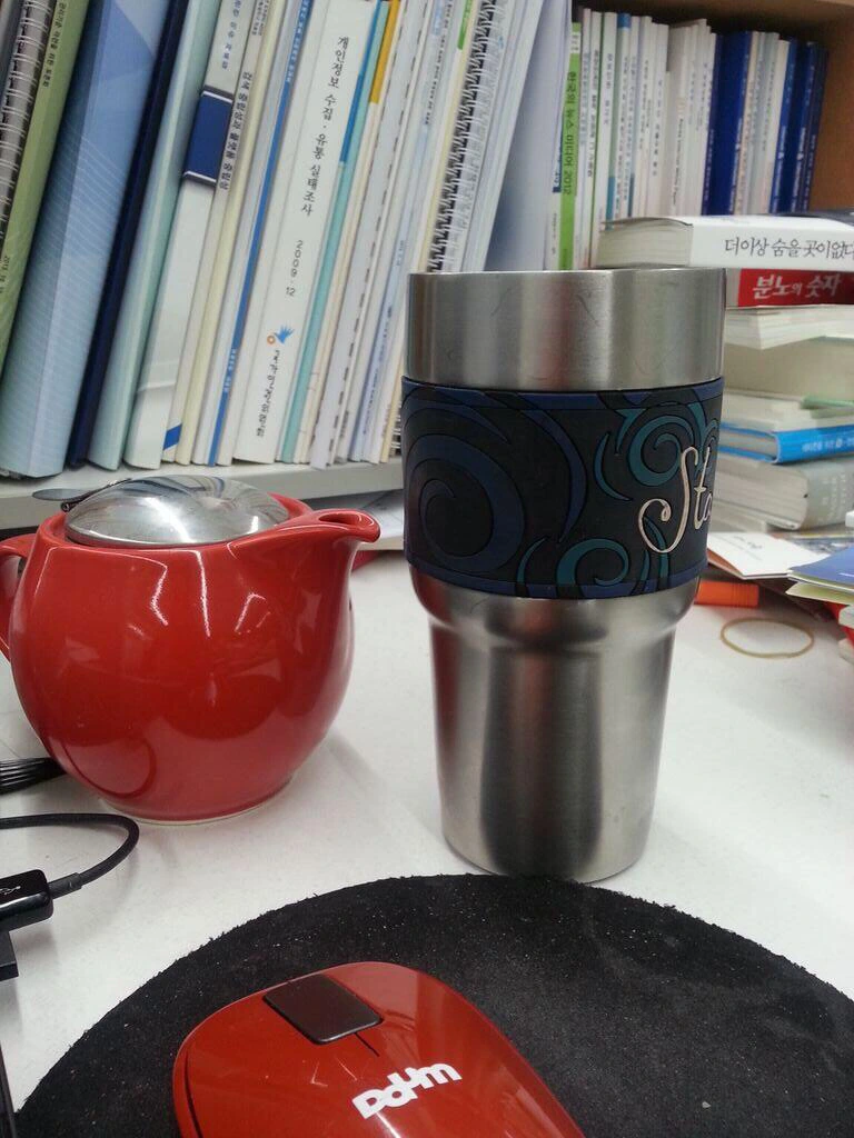 @hsjeong: 지구를 위한 착한 인증샷 올리면 공정무역 커피 등 상품 있다고 울 사회공헌 리더 @snyouk 님 귀뜸 덕에 지저분 책상샷! 10년 넘게 쓰고있는 제 텀블러에 대한 으리~수업이나 긴 외근엔 에코백에 넣어다님다ㅎ 저 텀블러는 사실 2003년 무렵부터 계속 쓰고 있습니다. 사무실 도착하면 가방 내려놓고 저 텀블러 들고 회사 카페테리아 가는게 매일 아침 일과입니다. 중간중간 물도 저 아이로 마셔요. 좀 지저분하긴 해요. 제가 날마다 씻지 않아서ㅠ 그래도 여즉 별 탈 없습니다.