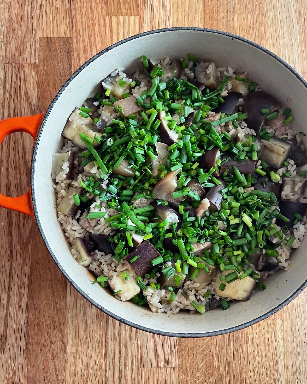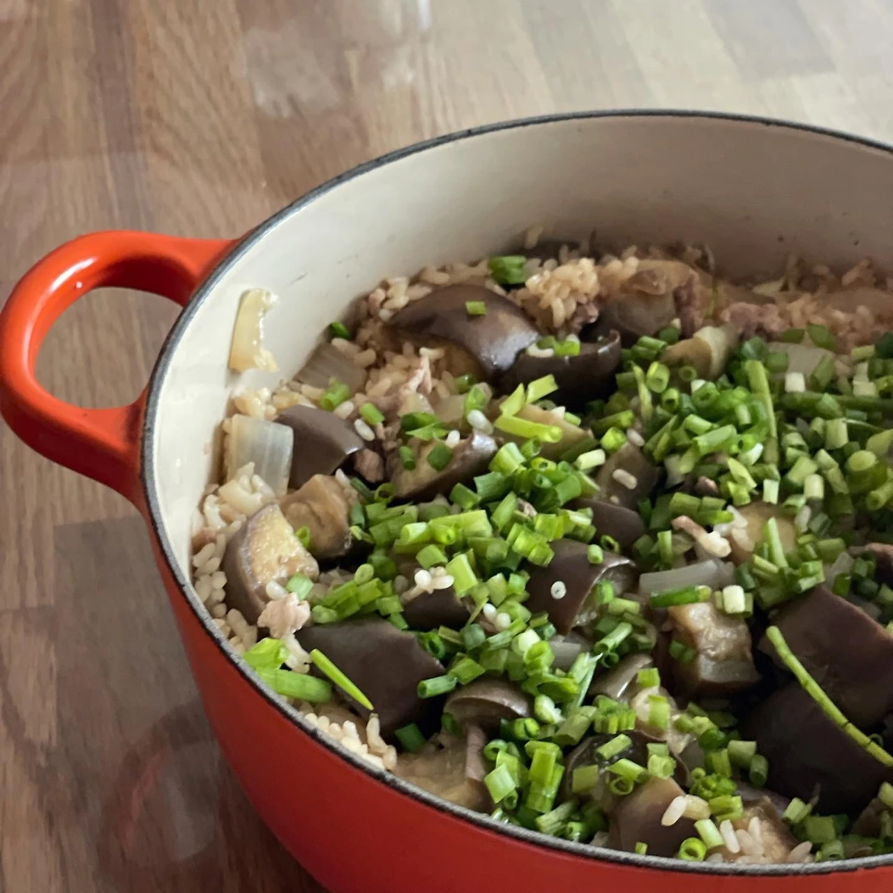 ㅁㅅ쌤에게 영감 얻어 따라해본 가지솥밥. 파마늘 돼지고기 가지와 양파, 씻은쌀 차례로 간장2 액젓1 볶는척 하다가 물붓고..쪽파는 역시 비주얼.
