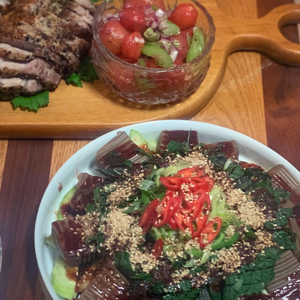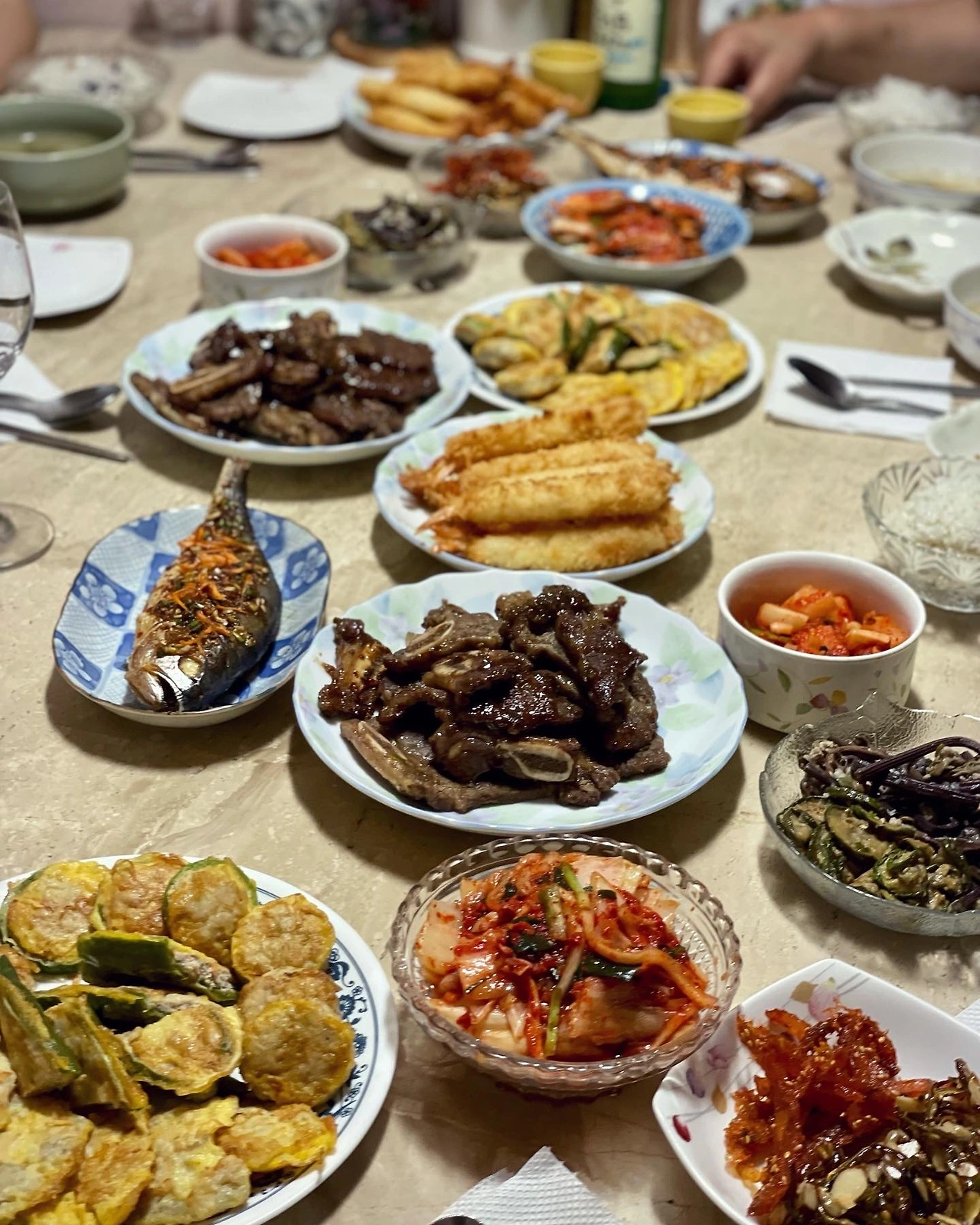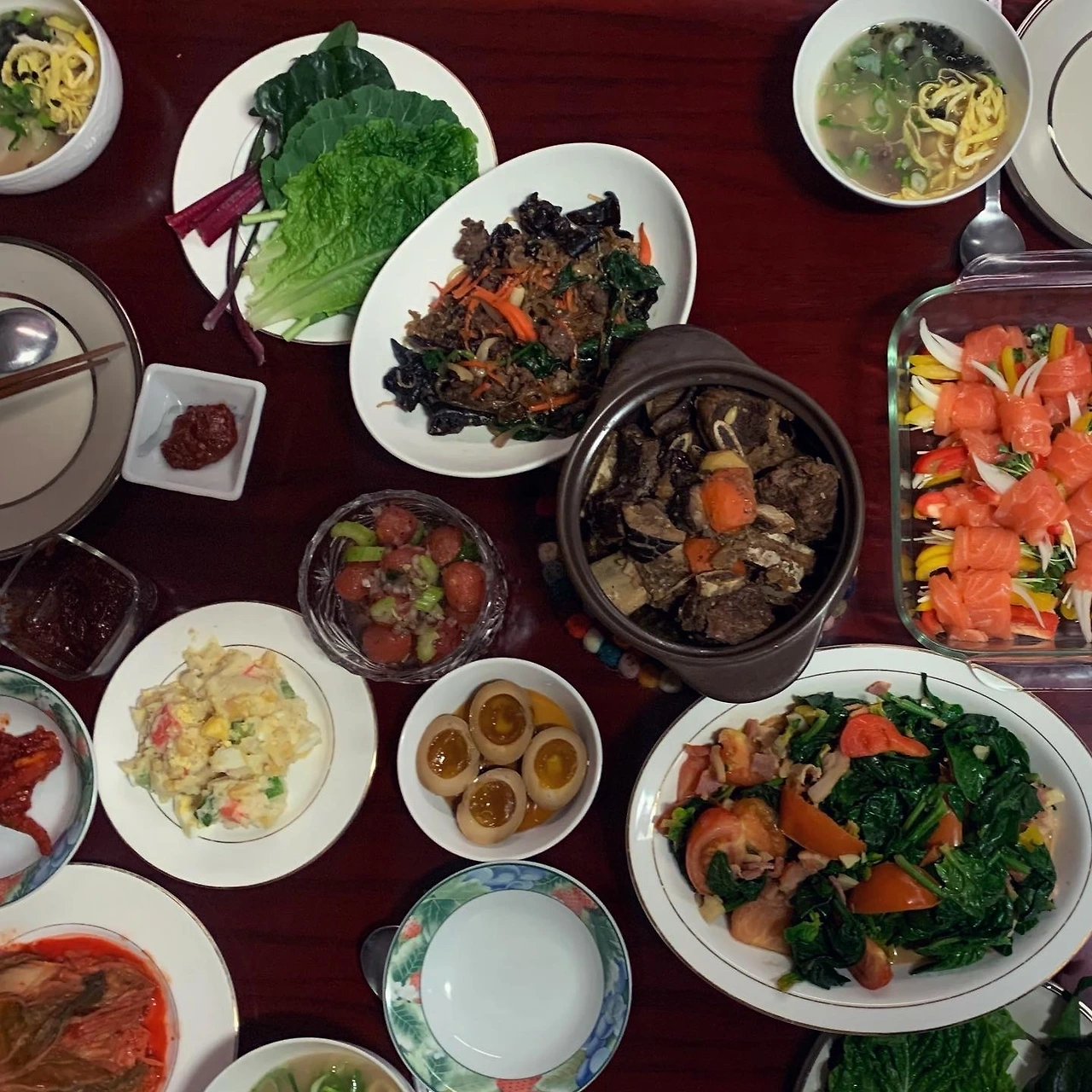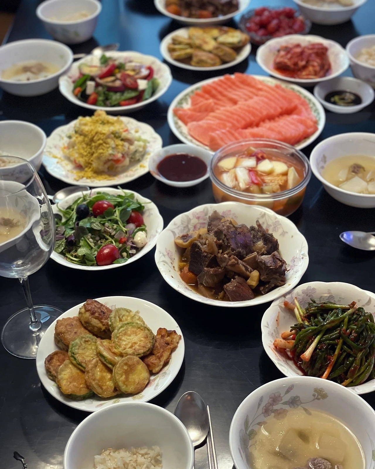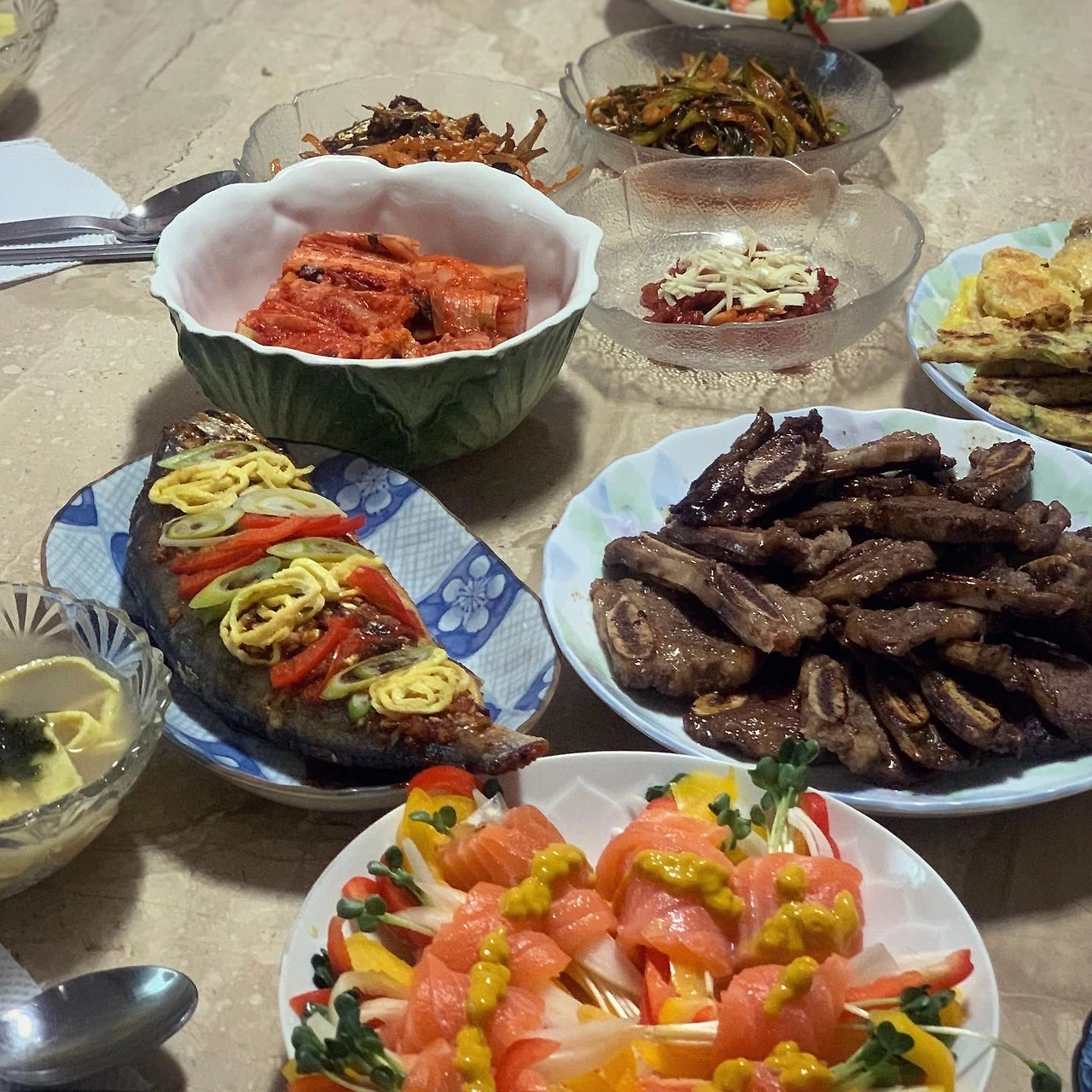 친지 모임 없는 명절이라니. 며느리노동절 해방 플렉스 휴일. 엄마가 미리 보내준 연어로 야채말이. 방울토마토 마리네이드만 했어요. 가벼운 메뉴죠. 친지들 없이 딱 부모님과 식사인데.. 시엄니는 갈비구이에 전, 조기찜을 혼자 준비하셨네요. 간단히 하신다는 말에 이럴줄 알았죠. 시장서 녹두전 재료 사간거 무색하게 단정한 시엄니 전. 엄마는 갈비찜과 잡채, 감자샐러드를 해오셨고 요즘 최애템 시금치토마토볶음만 추가. 아직 메인 디쉬는 엄니들 몫... 남은 음식 처리하다가 마지막 저녁은 샐러드. #마냐밥상
