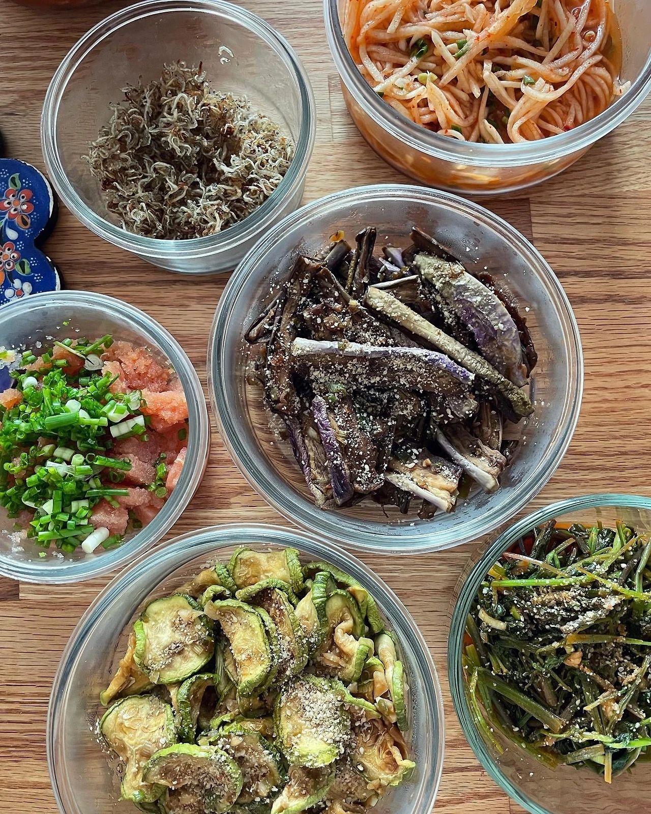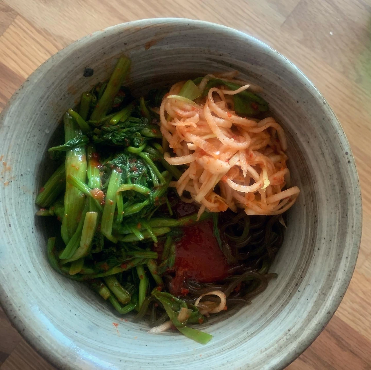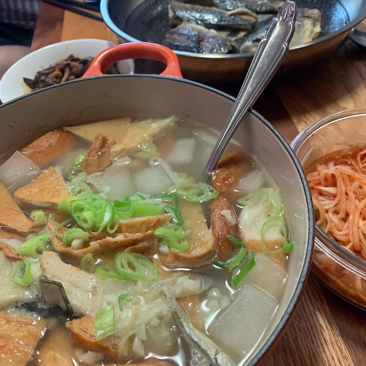 지난주에는 양배추 스테이크를 시도했고, 최애 무생채를 계속 활용해 비빔밥 했어요. 6월 초엔 들기름 막국수에 고수와 감태를 올려봤고요. 선물받은 어묵으로 전골도..