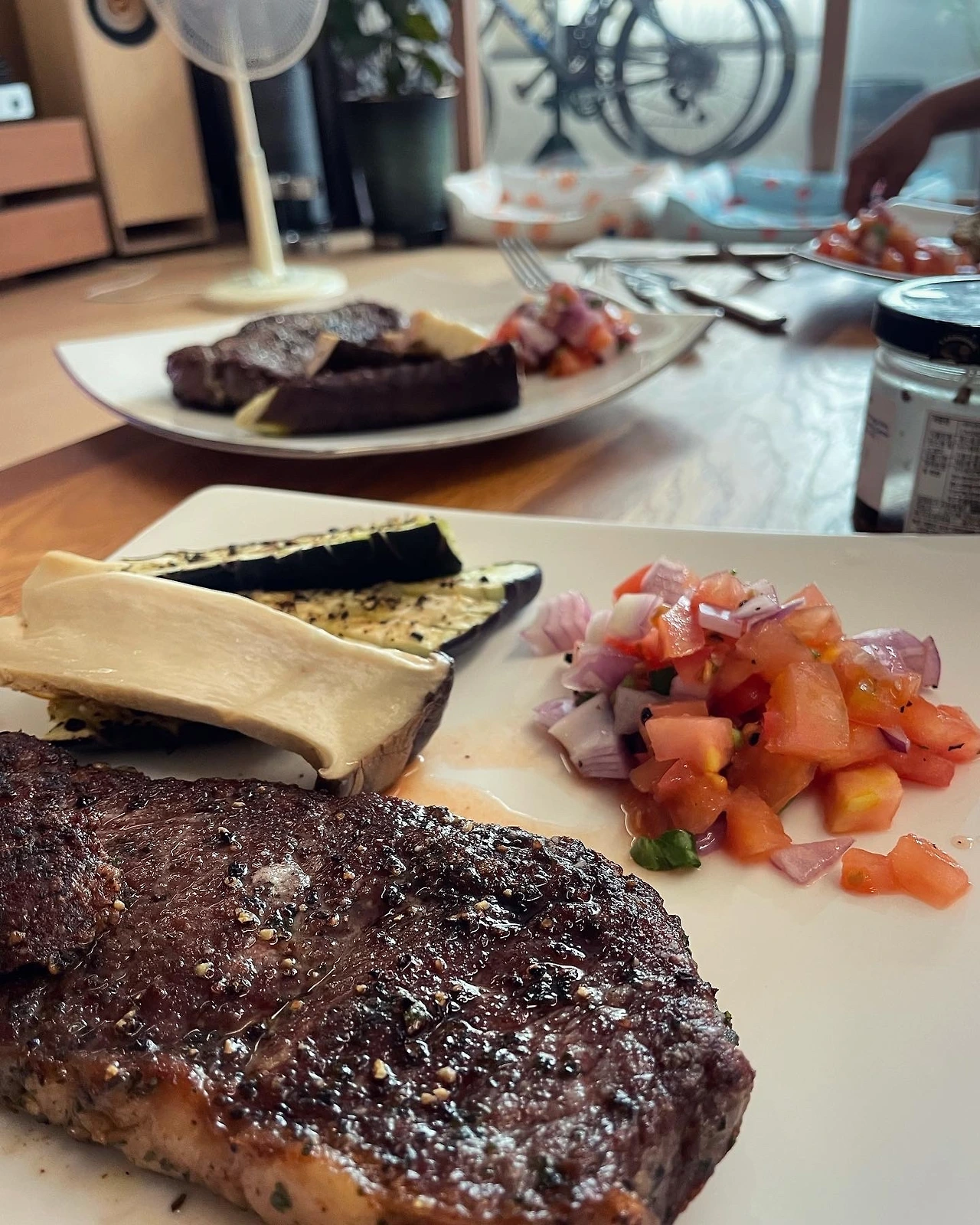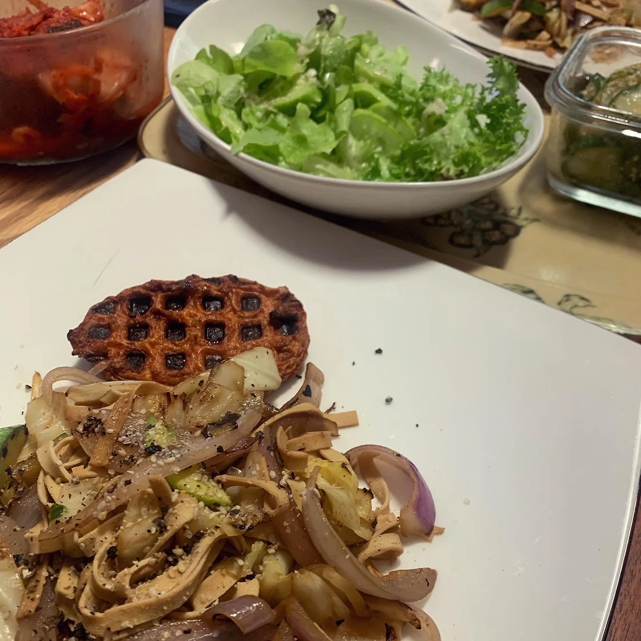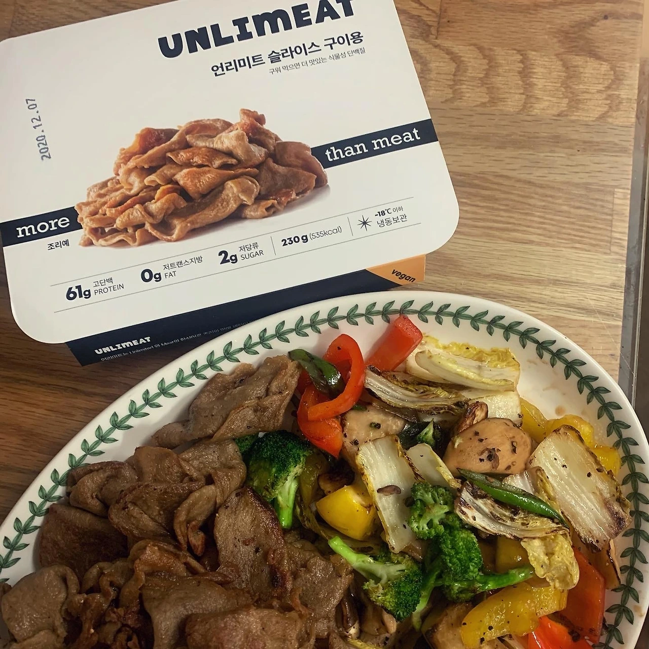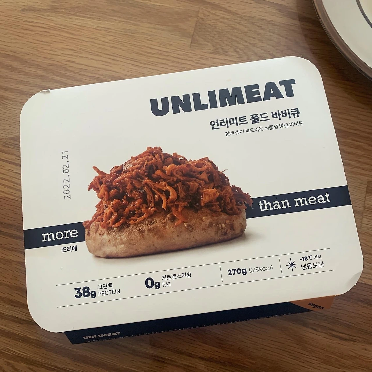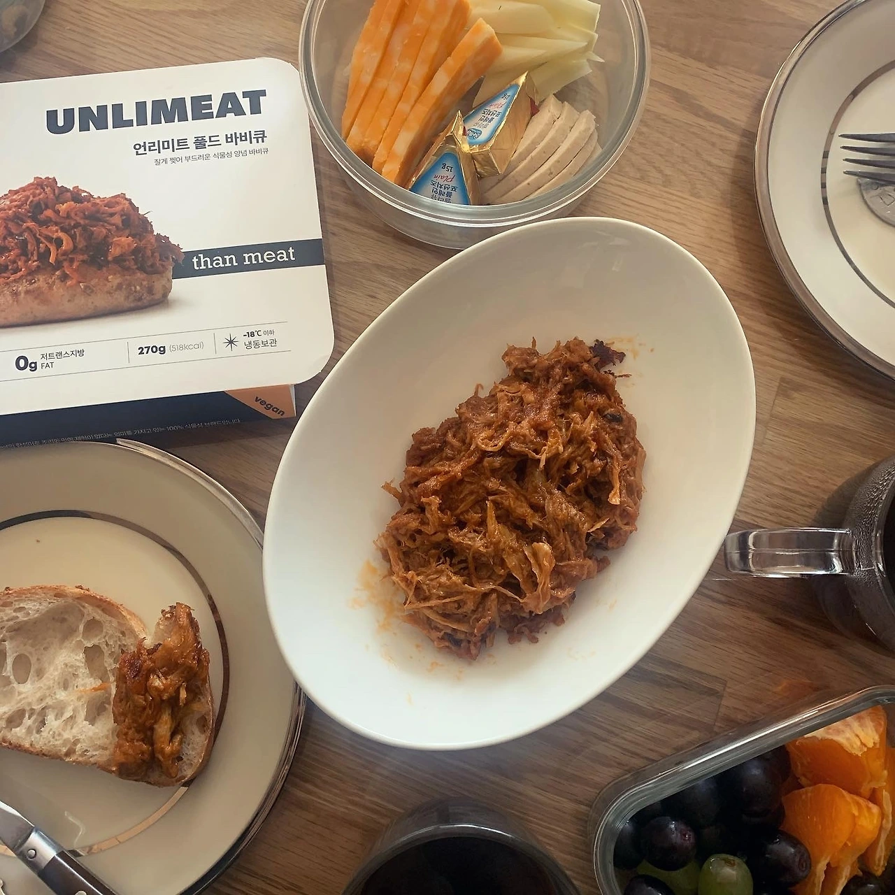 #언리미트 종류 별로 주문해서 하나씩 시식. 미국 임파서블버거나 비욘드미트는 주로 버거 패티를 내놓지만, 우리는 구워먹는걸 좋아하니 당연히 슬라이스. 제대로 맛보고 싶어서 소금후추만. 야채는 따로. 식감은 거의 유사한데 풍미는 다소 아쉽. 이건 단짠 불고기 양념으로 조리하면 꽤 괜찮을 것 같아요. 풀드포크가 훌륭한건 바비큐 소스 맛도 분명 한몫 한거였어요.