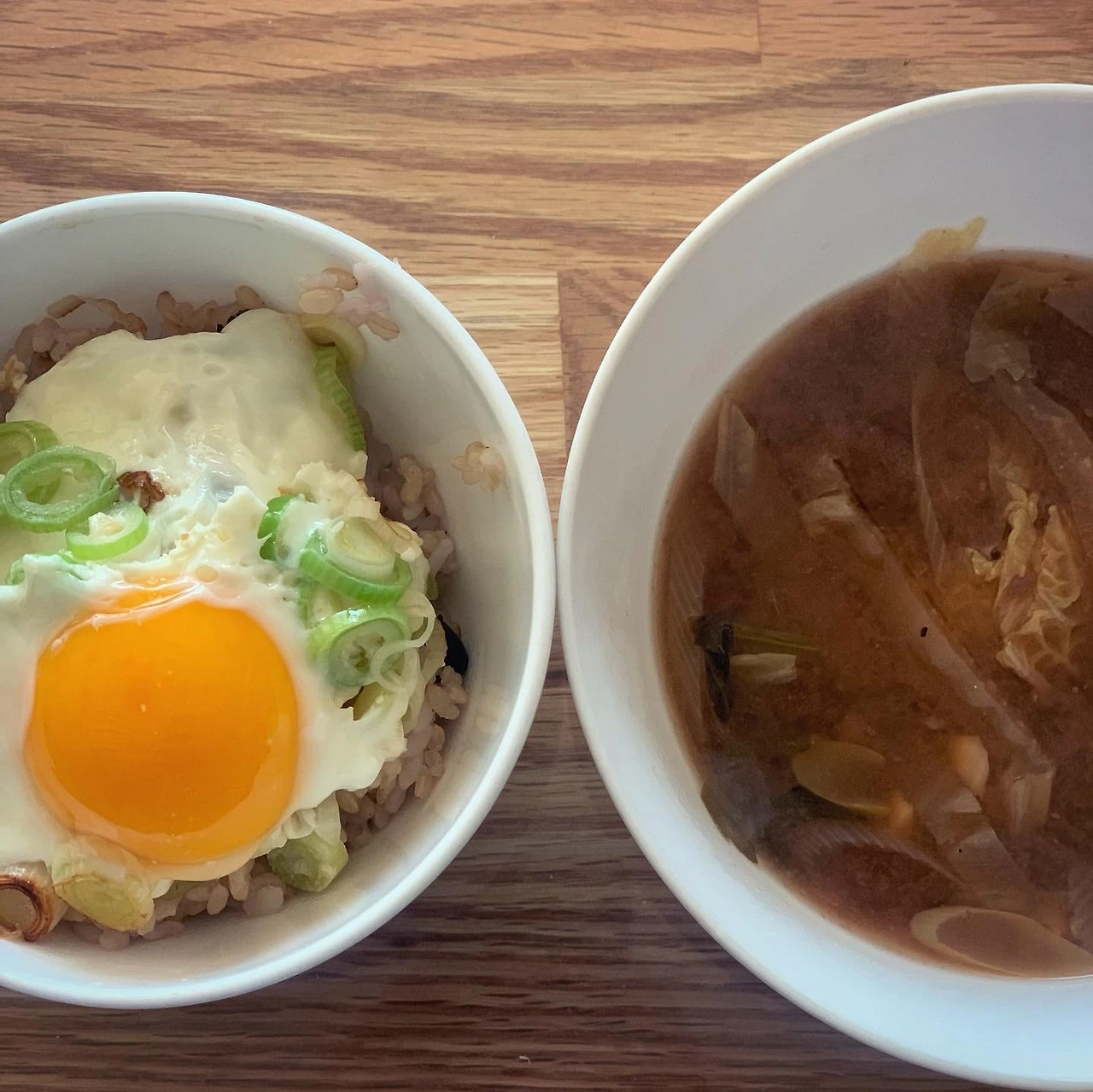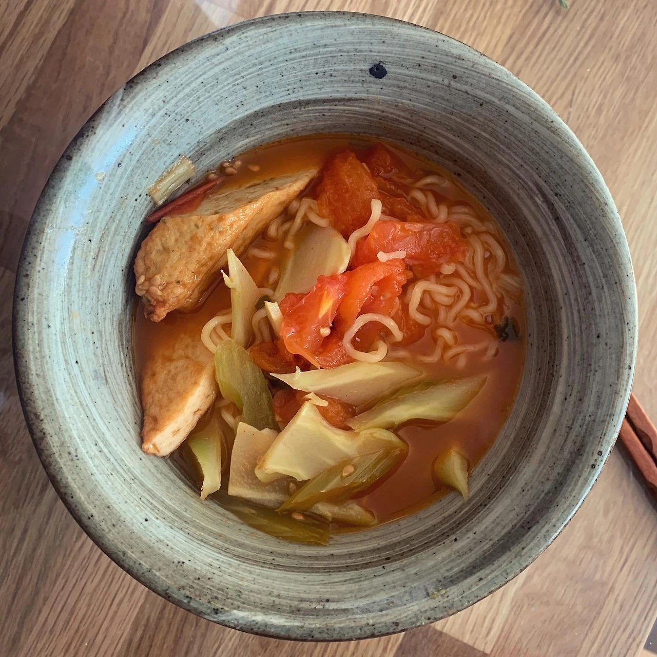 들기름에 파를 볶다가 부친 계란과 배추된장국, 토마토어묵브로콜리 넣어 라면 한 개로 2인분..