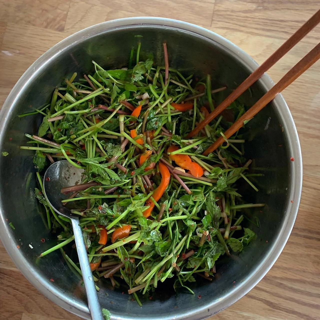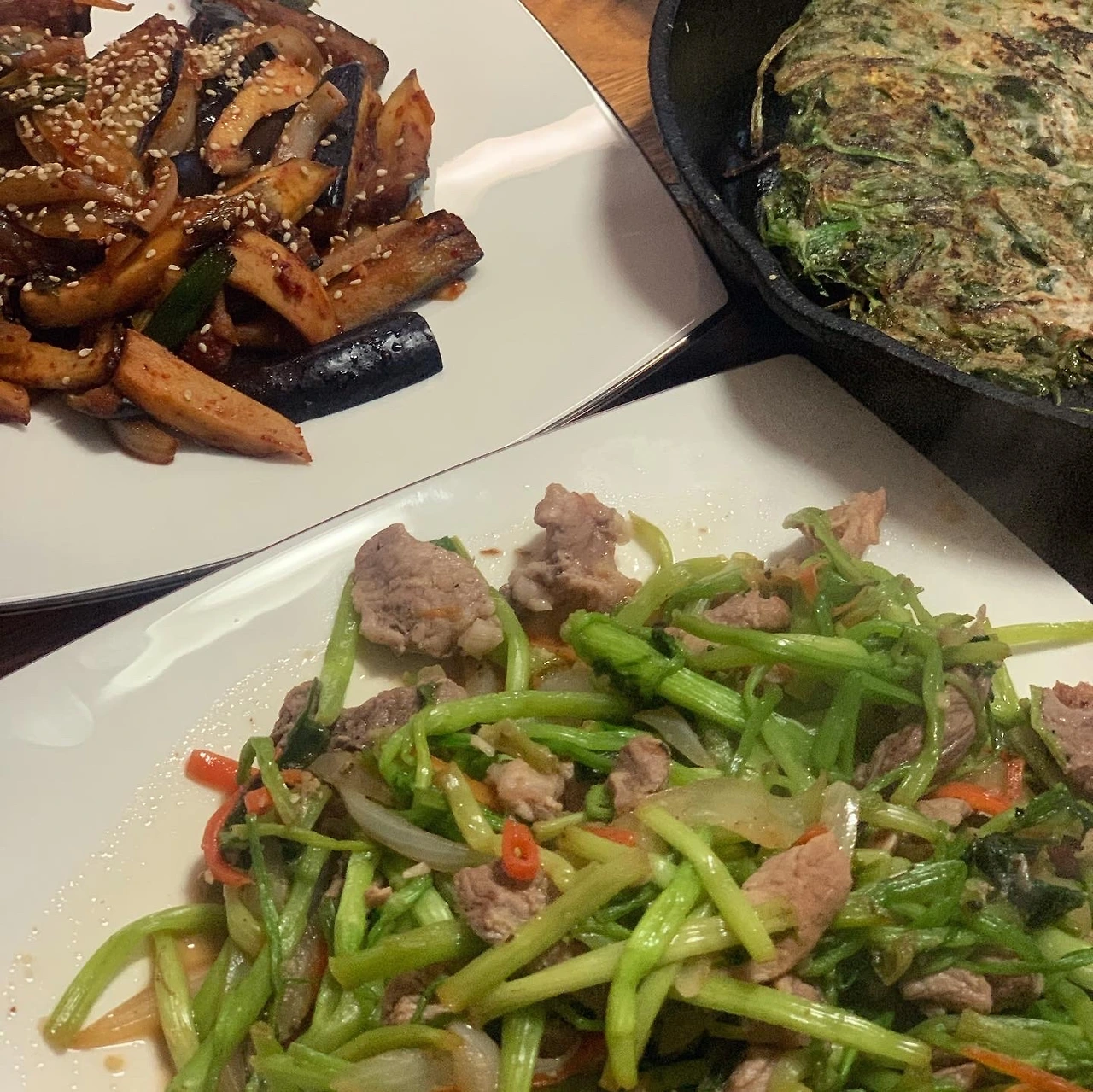 그리고 올 봄은 미나리! 동네슈퍼 미나리는 한 단이 많아서 고기와 볶고, 미나리전 따로 부치고..두릎 먹을 떄도 미나리전 곁들이고. 비빔국수에도 올리고. 봄의 #마냐밥상