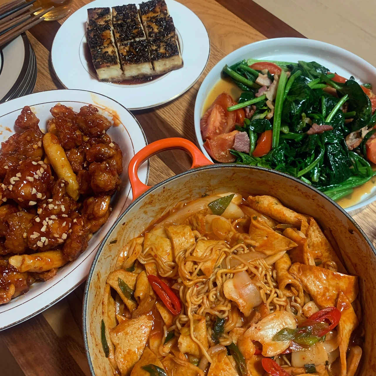 귀가 후 급히 준비한 #마냐밥상. 냉장고 재료 밖에 없어서 메인은 #라볶이. 떡, 어묵, 라면에 양파, 파, 고추장고춧가루간장설탕+라면스프. 그냥 물 넣고 끓이다 참기름 휘릭 끝. 다행히 옛동료 D 최애메뉴.두부에 칼집 넣어 바질통후추+간장꿀연두올리브유 200도 20분. 풍미 좋다며 다들 이게 뭐냐는데 트위터 핫템 #두부구이. 노동력 3분 필요.들기름에 마늘베이컨토마토 순서대로 볶다가 시금치 넣어 간장 두 숟가락, 숨만 죽으면 끝. #시금치토마토볶음 저녁 일정 취소됐다며 조촐한 우리 모임에 낀 옆지기가 닭강정을 사들고 귀가한 덕분에 그럭저럭 손님상. 각자 자리에서 어찌나 잘하고 계신지 고마울 뿐. 그리고 각자 동네마다 어찌나 사연많은지, 와 대한민국.