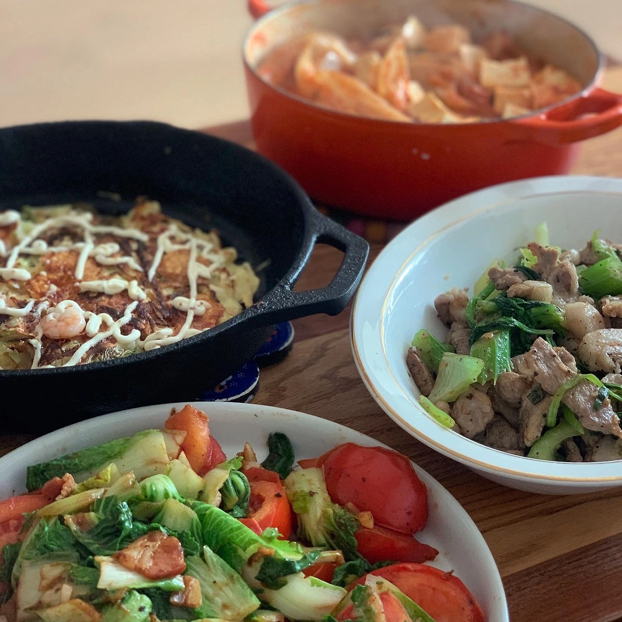 최근 유일하게 신경쓴 지난주 일요일 밥상. 휴가 나온 아들이 허리 디스크에 위염이 심해져 토사곽란에 두통. 휴가 나와서도 내내 트림.. 양배추와 토마토를 익혀 먹도록 고심. 야매 오코노미야끼와 봄동토마토볶음. 목살은 샐러리와. 나머지 끼니는 친구들에게 밀렸... 씩씩한 군인은 커녕, "엄마, 난 병약한가봐"라고 말하는 아이에게..엄마가 해줄수 있는건 거의 없는 즈음. 몸 만든다고 신났더니, 몇달새 수척해졌고..하지만 몇달 뒤엔 병장이라고요. 잘 버텨주기를.