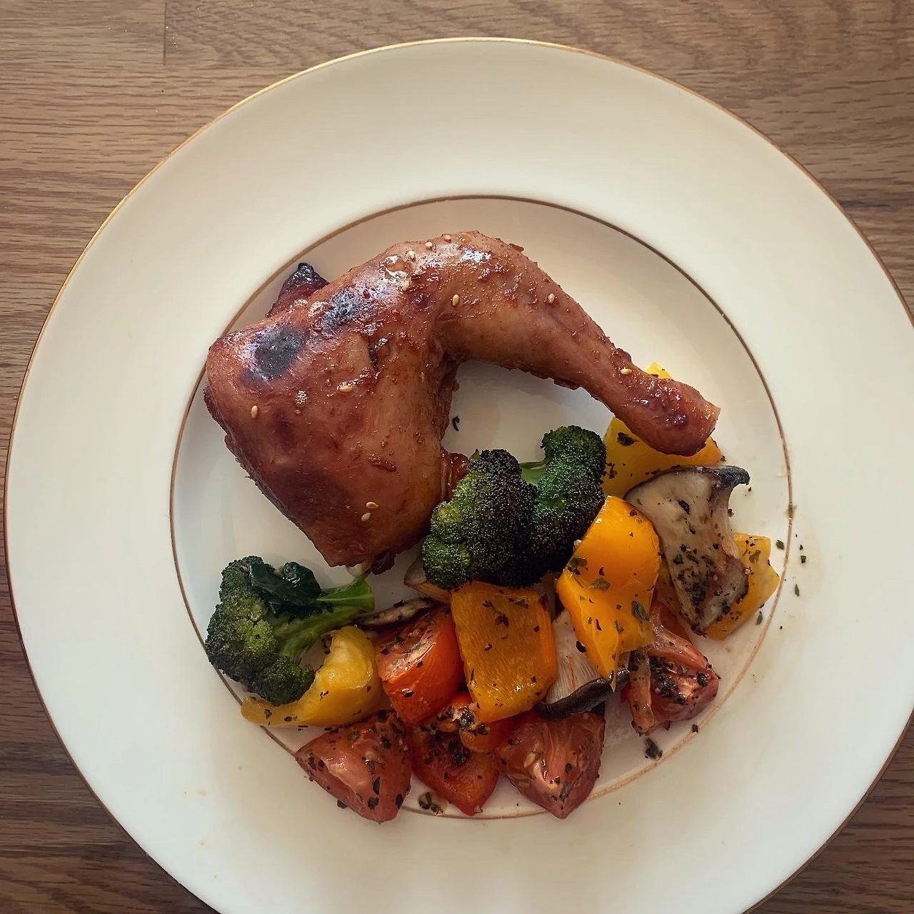 딸픽 마트세일 닭에 구운야채. 냉동실 닭가슴살 버거와 남은 어묵샐러리볶음 차리는데 딱 10분.