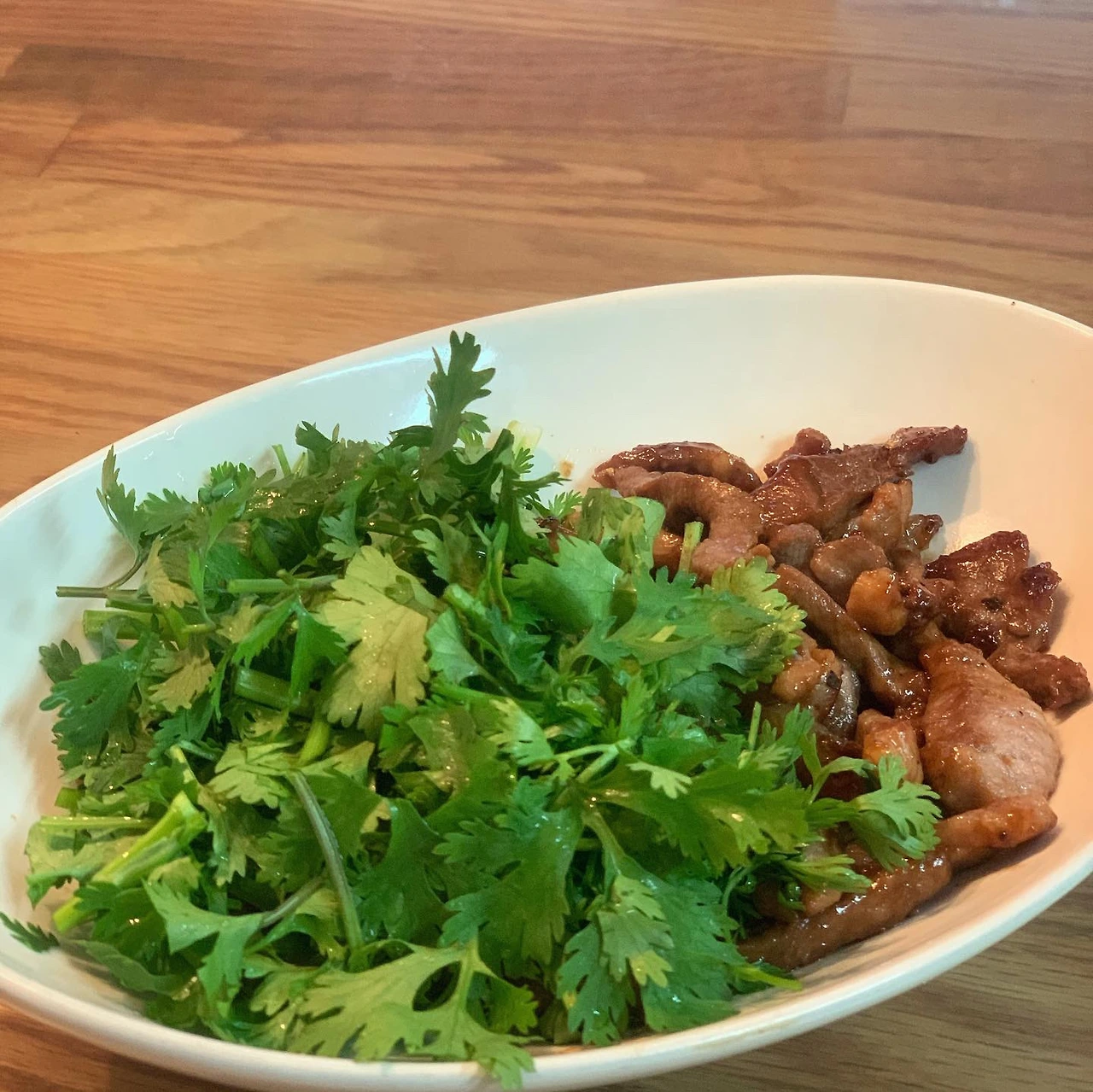 돼지고기 약간에 간장:액젓:설탕 각1 비율로 단짠 볶은뒤 고수를 듬뿍 올렸어요. 예전 심야식당 메뉴 야매로 흉내낸겁니다.