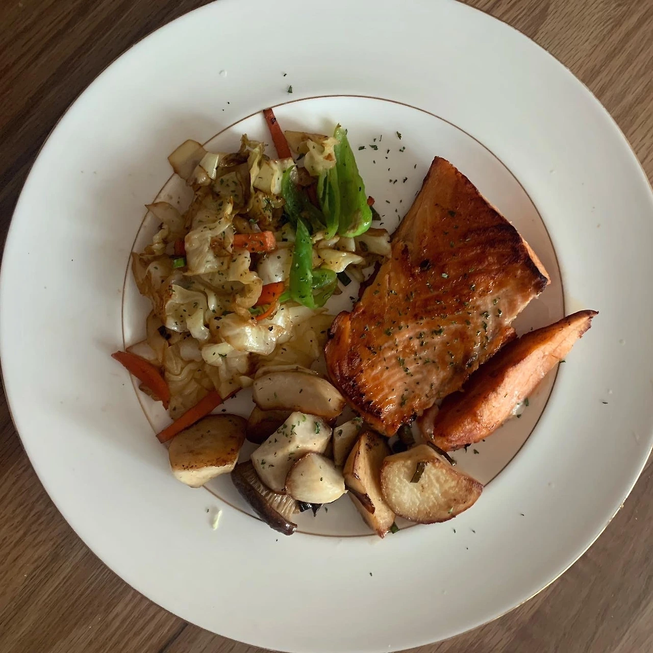 설에 엄마가 보내준 연어 남은거 굽고. 야채볶아 어제 점심.