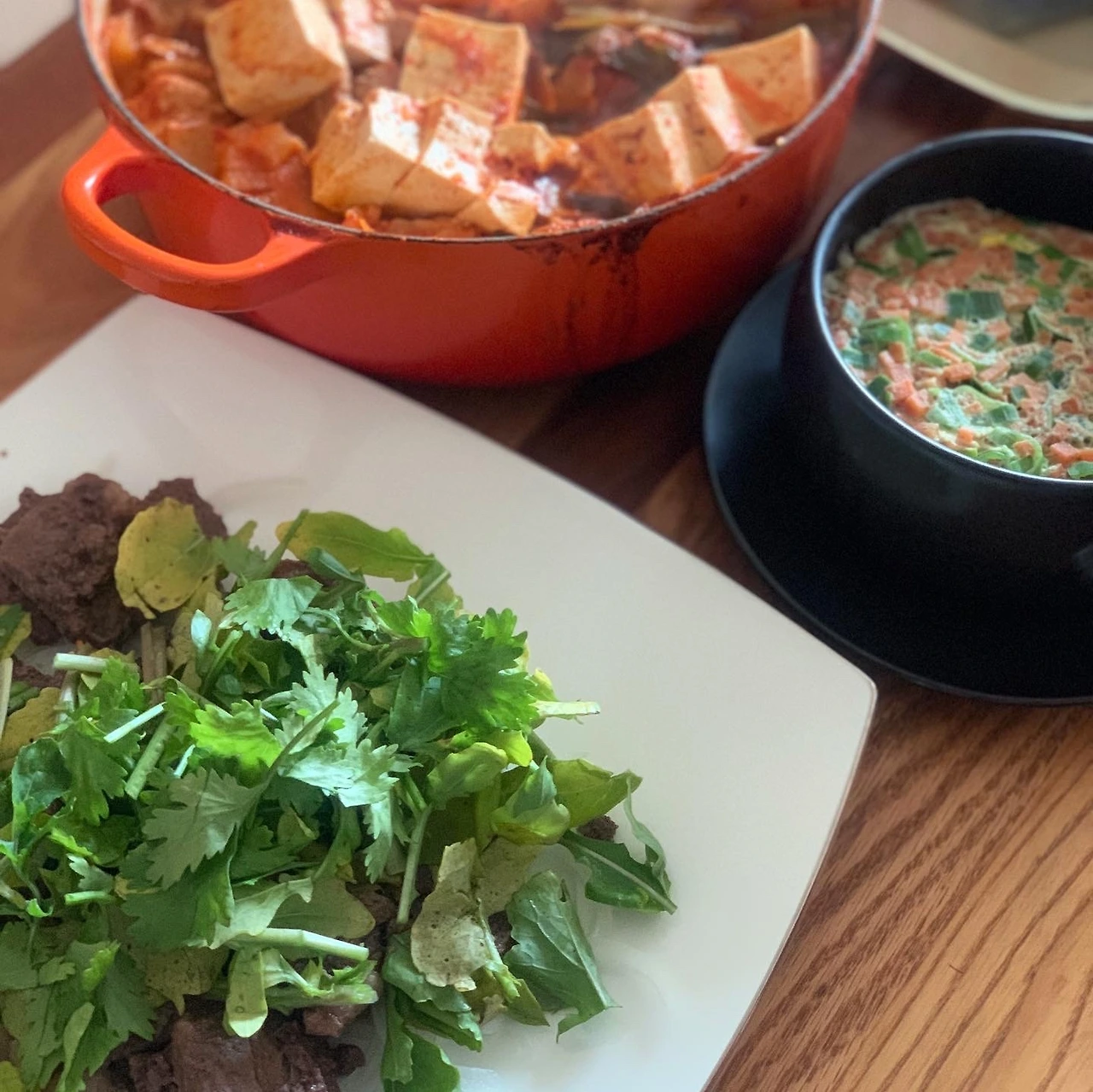 따끈 현미밥에 김치찜, 계란찜, 양파 깔고 루꼴라와 고수 얹은 고기로 밥솥부활 기념 #마냐밥상. 정작 밥 사진은 없..