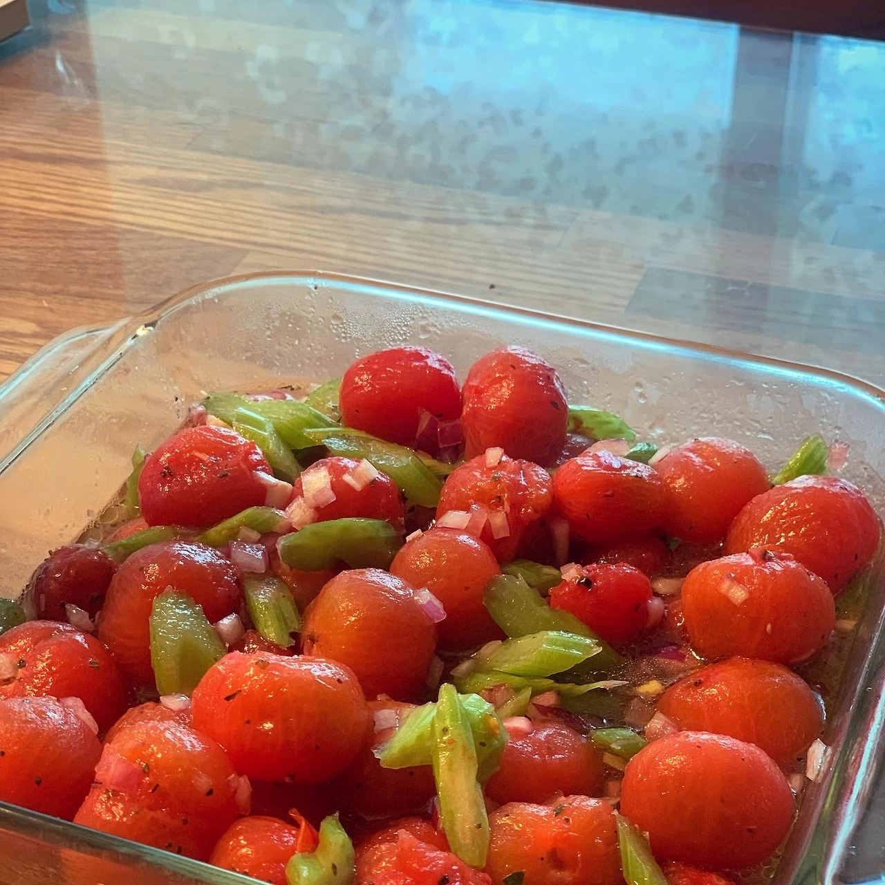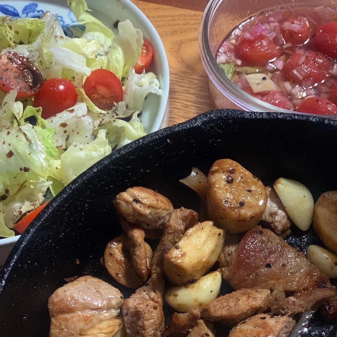 방울토마토 큰팩 산 덕분에 마리네이드 만들고 샐러드에 쓰고. 순전히 토마토에 곁들이려고 고기와 버섯 구이.