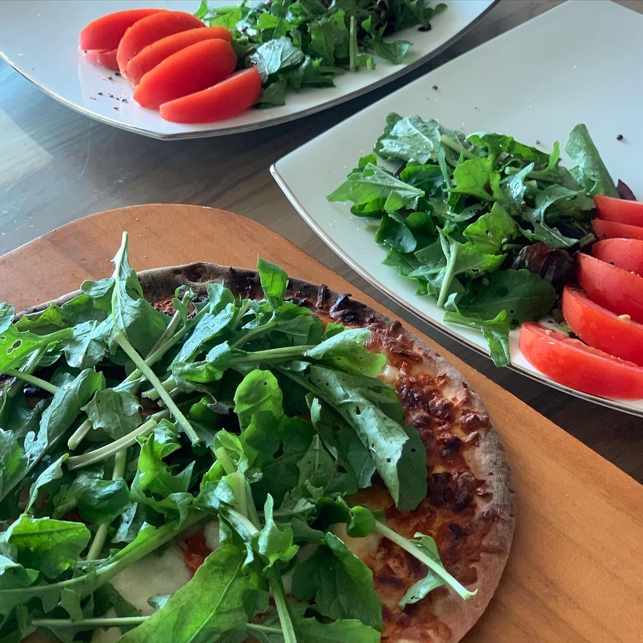 꾸러미 덕분에 루꼴라 풍년이라 피자 위에 듬뿍. 샐러드도 고소하게.