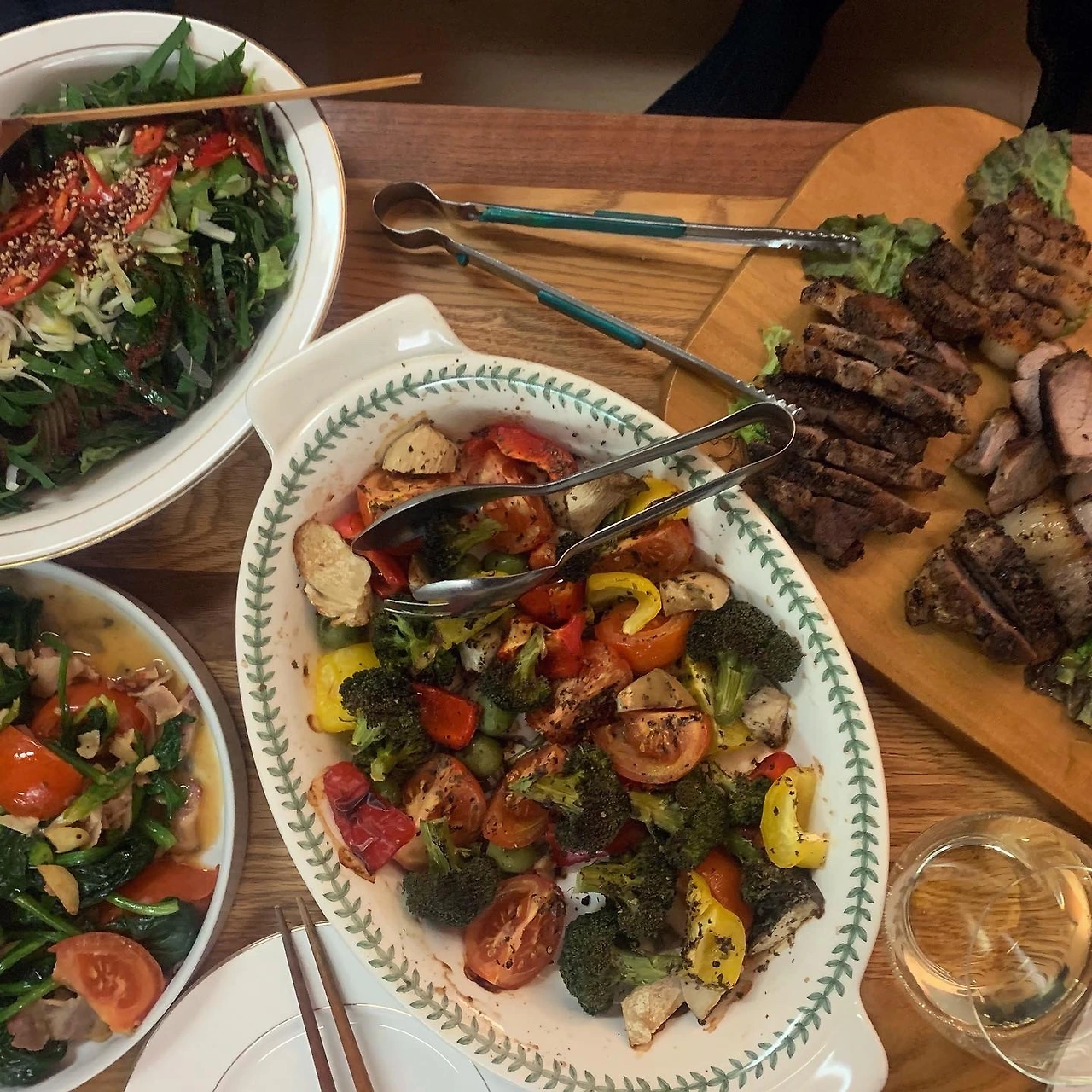저는 요즘 시간 없다는 핑계로 점점 더 시간단축형 메뉴만 계속 반복. 새 메뉴 개발도 않고 채소허브구이, 고기, 시금치토마토 볶음, 묵무침 후다닥 하는데, 그래도 집으로 불러 밥 한 끼 먹인다는 기분 자체는 충만.. 여자 넷이 저걸 다 해치우다니. #마냐밥상
