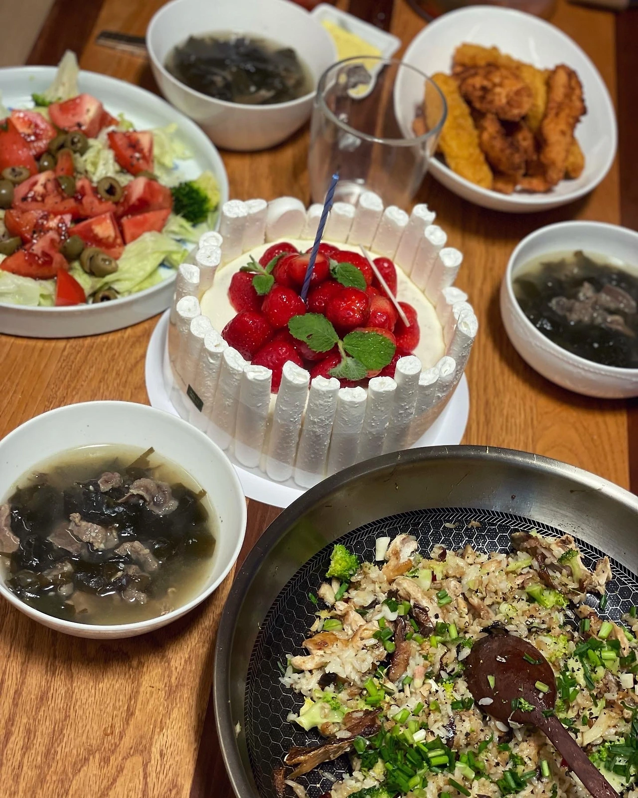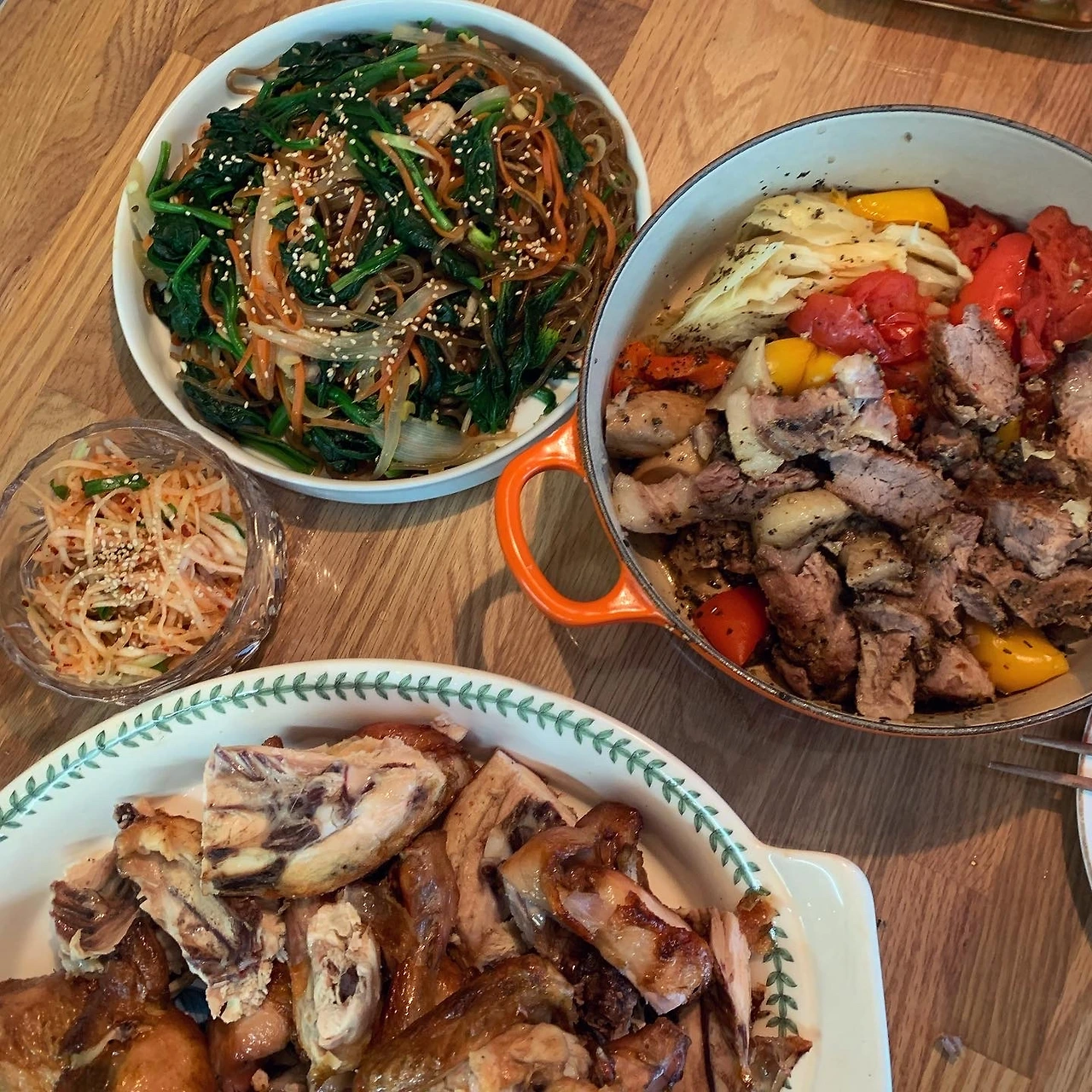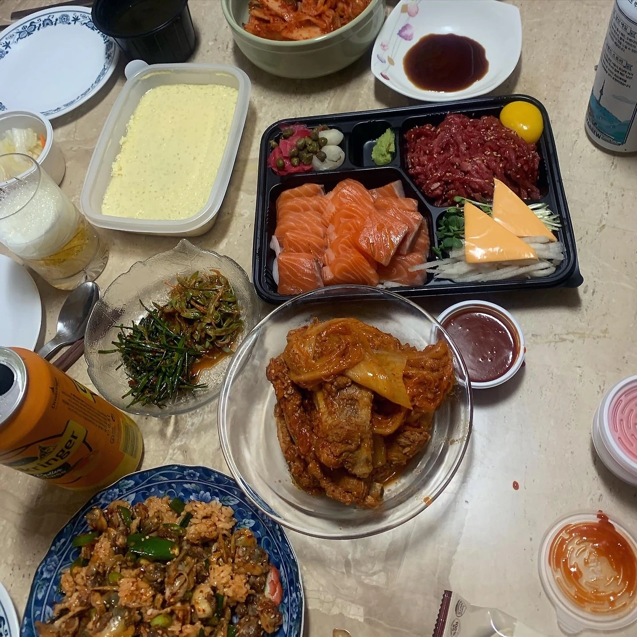 안하던 무리에 당 떨어져서 오리올에서 크로플, 브라우니, 스콘까지 다 챙겨먹은뒤.. 집 앞에서 딸기가 사준 치킨에, 급히 돼지 목살과 양배추, 버섯, 토마토, 파프리카 올리브찜. 그리고 잡채와 무생채.. 냉동해둔 튀김소보로에 라구짜장, 참외, 레드향까지.. 딸기네와 함께. 1만보 걸은게, 다 이렇게 해치우려고 한거죠.. #마냐밥상