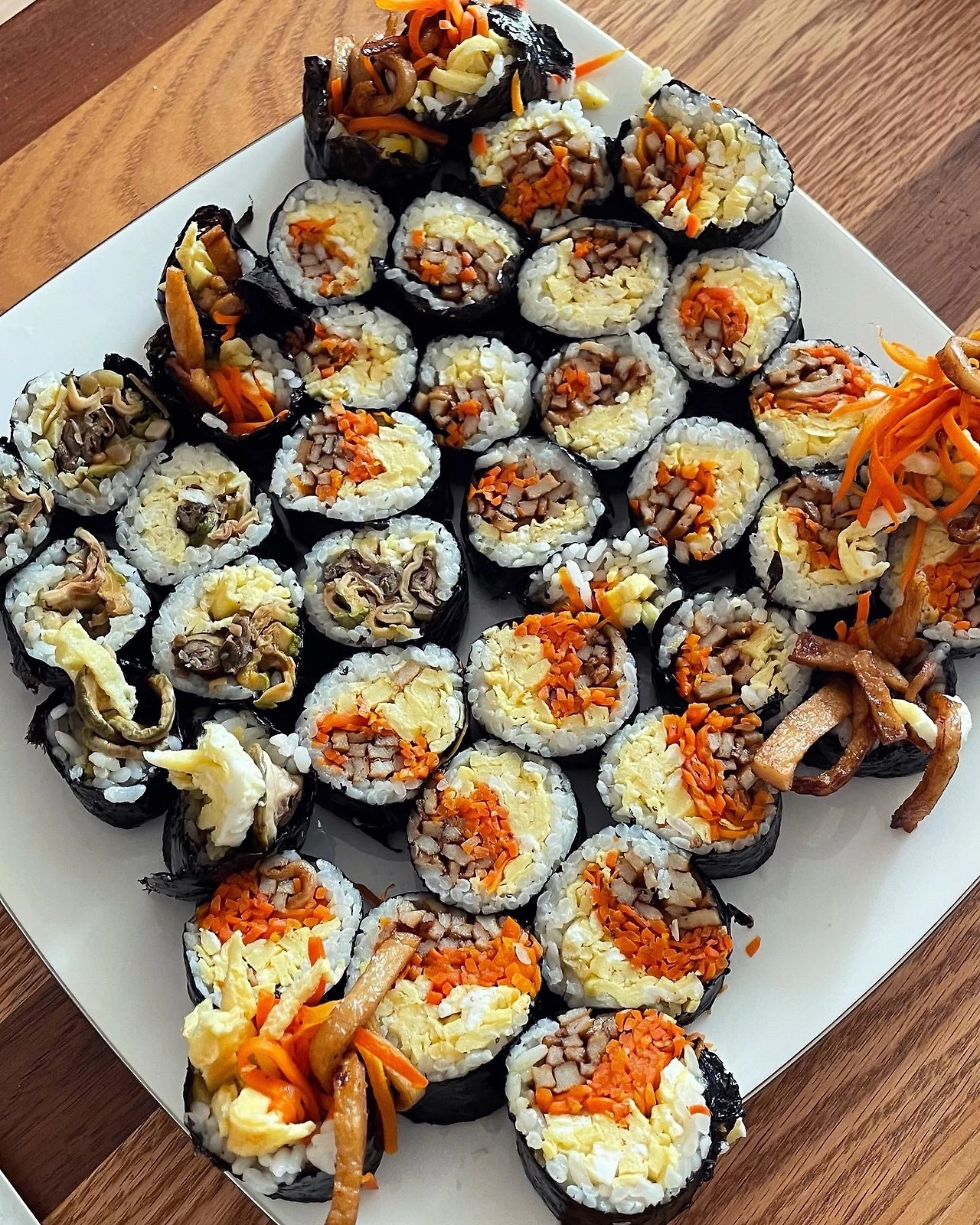 휴일 첫날. 3일 된 찬밥 처리용 대충 김밥. 시금치 무침과 당근 볶음, 소세지 등 냉털 재료로 얼렁뚱땅. 문제는 밥이.. 데워서 소금 간하고 참기름 둘렀지만 푸설푸설.. 찰기가 부족해 난망.. 그래도 뭐, 한 끼 후다닥. 저녁은 치킨을 주문했으니..며느리노동절 전날 전 안 부치고, 일 안하니 무척 좋군요. 내일 아침 시댁에 일찍 가면 되요. 친지들이 오지 않아 간단 차림.. 저는 부치기만 하면 되는 녹두전 재료를 시장에서 충동구매했고, 시엄니 준비하실 기름진 메인 보완용 상큼 토마토 마리네이드, 엄마가 보내준 연어를 녹여 연어야채말이만 준비했어요. 지난 추석에 이어 며느리노동절에 해방을 누리다니.. 코로나가 바꾼 풍경, 이건 좀 정칙됐으면... #마냐밥상