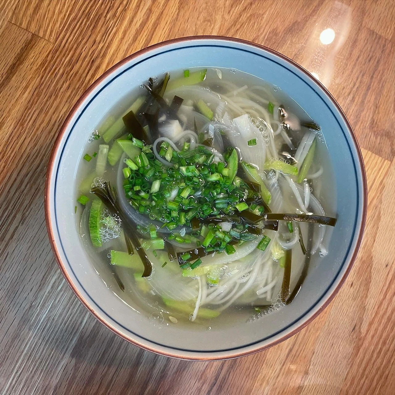 멸치다시마육수에 그냥 호박양파 국수. 우려낸 다시마는 아까워서 채쳐서 어떻게든 해치워요.
