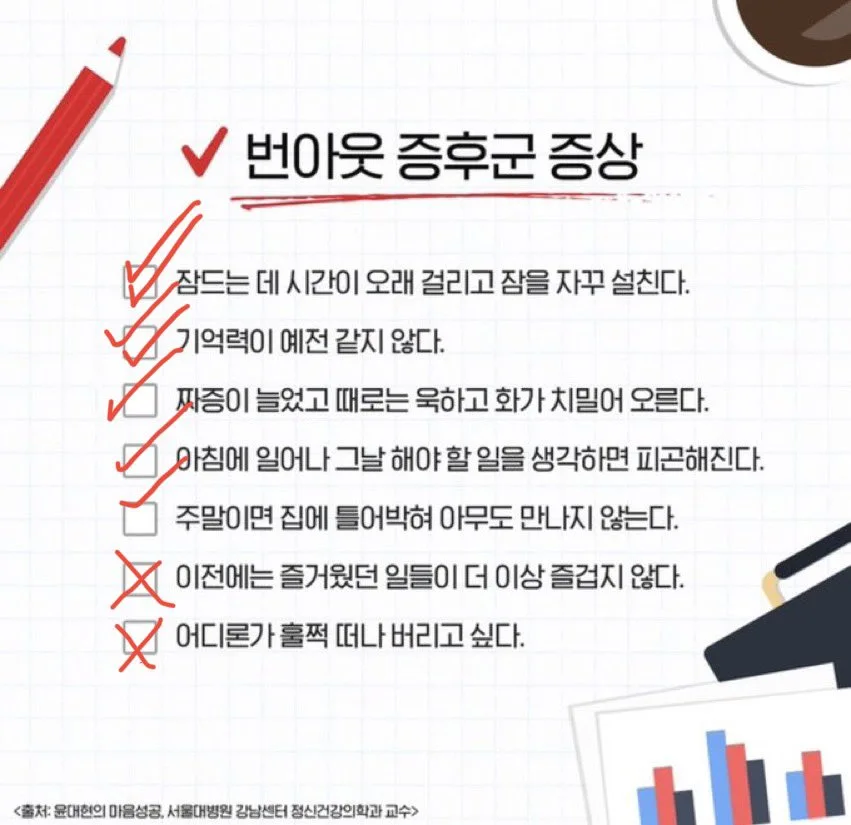 책을 붙잡지 못한채 여름을 보냈다. 마음의 여유가 바닥났고, 최근에는 자존감 위기를 평생 처음 겪으며 좀 너덜너덜했다. 우연히 번아웃 짤을 보니 이건가 싶기도 하고.