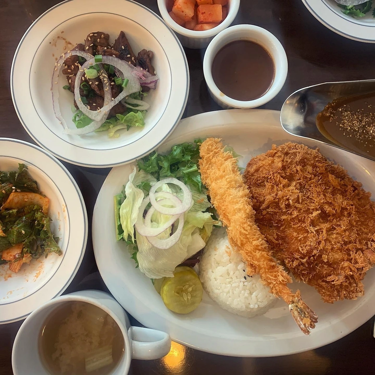 새해 첫 외식은 성수동 #윤경양식당. 허름하고 좁은 계단 입구에 고풍스런 나무 간판까지 진짜 경양식 느낌인데.. 윤경 양식당 이라는 D의 설명. 1.5만원 대표 메뉴 주문하니 고소한 겉절이에 깍두기, 컵에 담은 배추된장국, 소스 용기 제대로 카레소스가 같이 나오고. 진짜 두툼하게 잘 튀긴 돈까스와 새우튀김에 간장목살구이까지. 다행히? 밥까지 맛있진 않아서 밥만 남기면 됩니다..