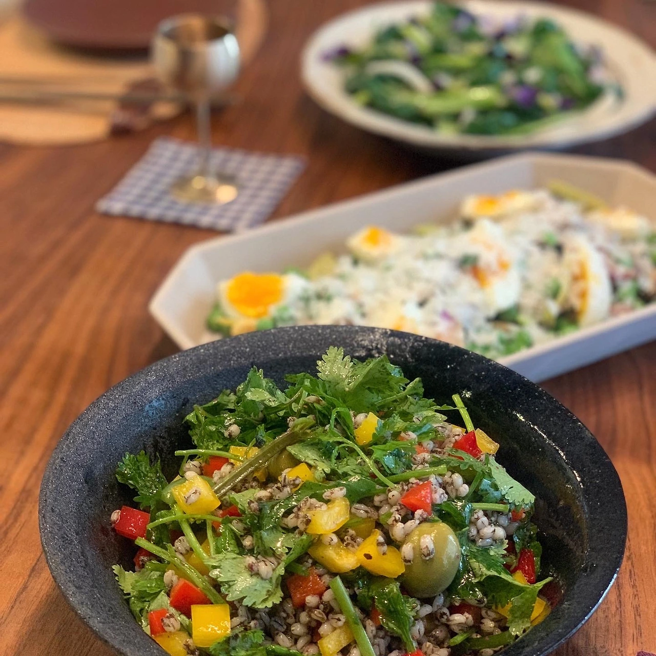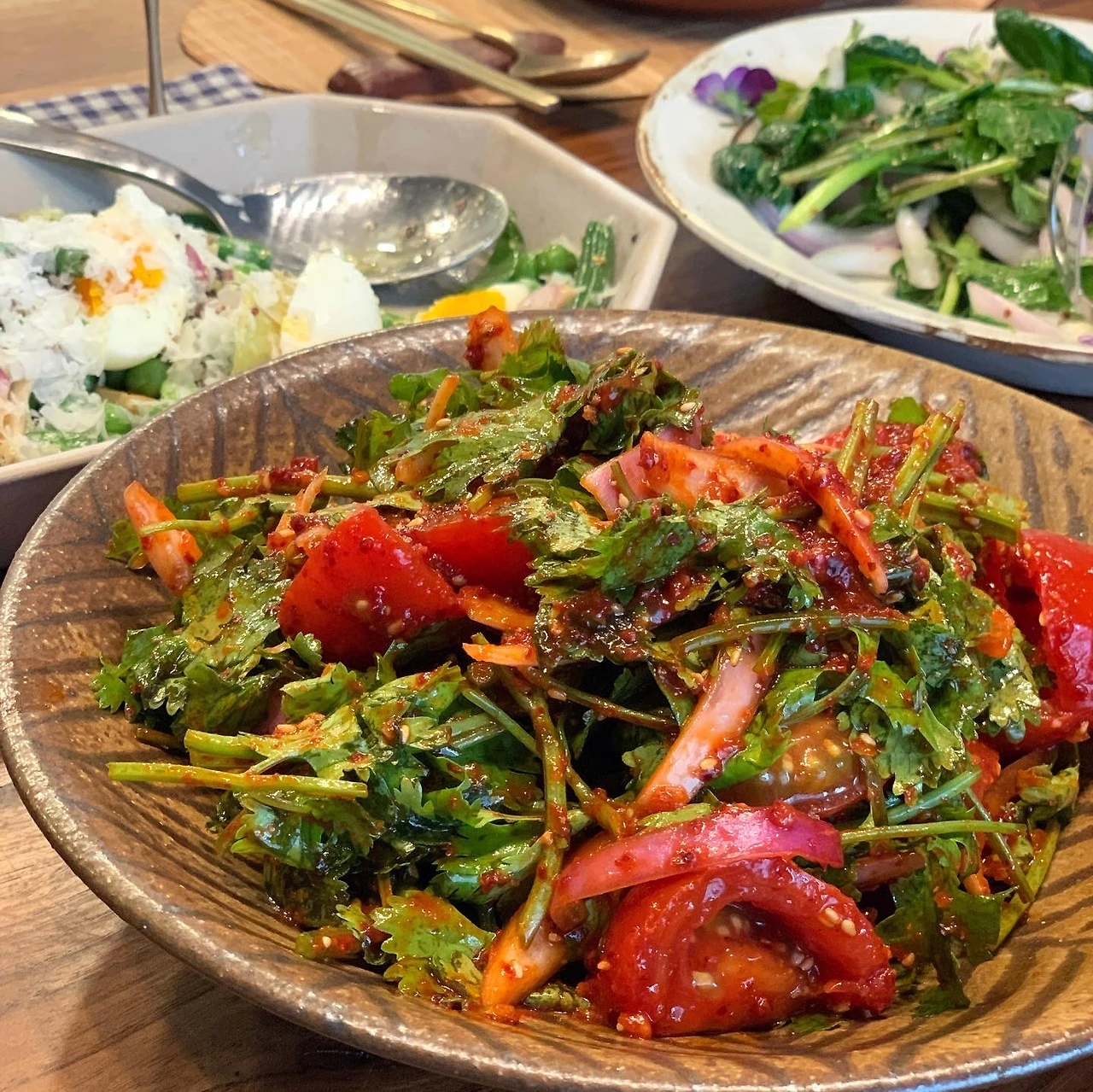 #저와함께식사하실래요? 내 이름이 박힌 메뉴판! 꽃도 냠냠 플라워 가든 샐러드, 완두콩 샐러드, 흑보리고수 샐러드 등 기막힌 샐러드 향연으로 시작해 유자를 품은(새우와 크래미, 생율, 오도독 오이, 양파도 품은) 영양냉채, 믿기지 않게 부드럽고 풍미 좋은 궁중떡잡채, 끝내주는 떡갈비와 (고소하게 무친 오이지, 토마토 마리네이드, 현미밥에) 된장찌개, 그리고 환상적인 고수 듬뿍 토마토김치, 온 정성이 투입된 금귤정과와 요거트까지.. 음식이 나올 때 마다 탄성. 남으면 싸갖고 가자더니 싹싹 비웠어요.