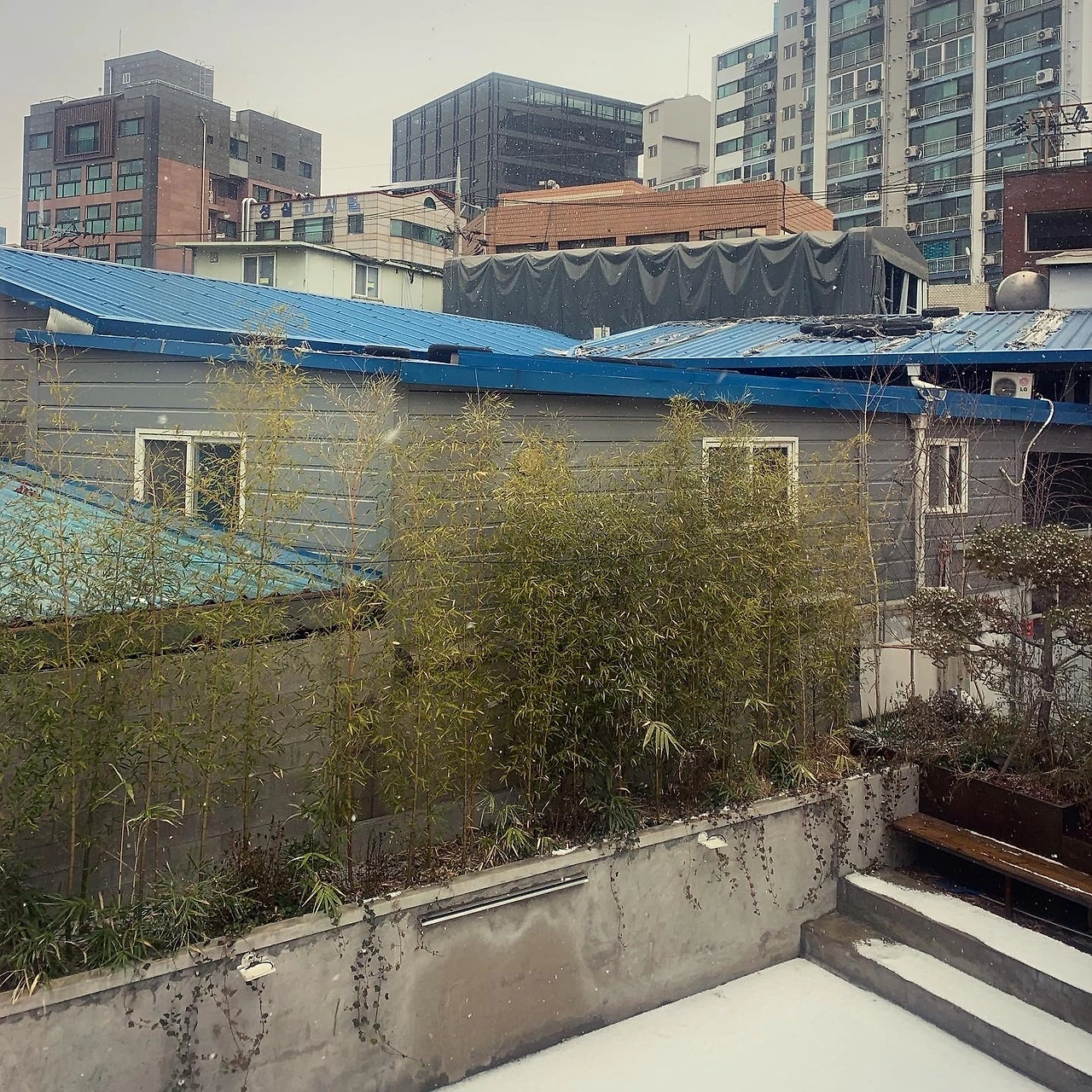 어떤 관점은 이슈 뿐 아니라 공간과 음식도 다르게 만들어줘요. D이 안내해준 디저트카페 #옹근달. 2층 큰 창 뷰에서 커피와 브라우니를 놓고 일 얘기에 몰입하다가 D가 뷰에 대해 한마디. 눈쌓인 정갈한 마당과 공장 담벼락, 골목 너머 고시원, 힙한 오피스, 아파트가 프레임 안에 어울린 풍경. 시간이 쌓인 도시의 골목이란게 이런거구나 싶더군요.