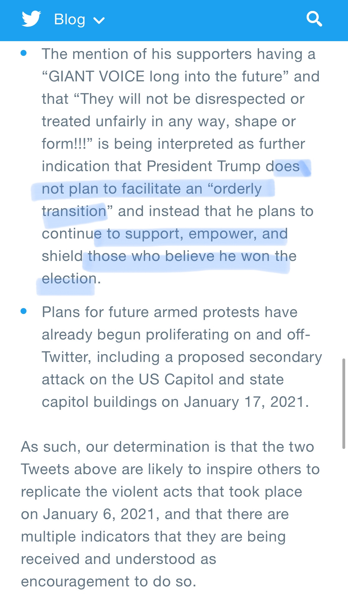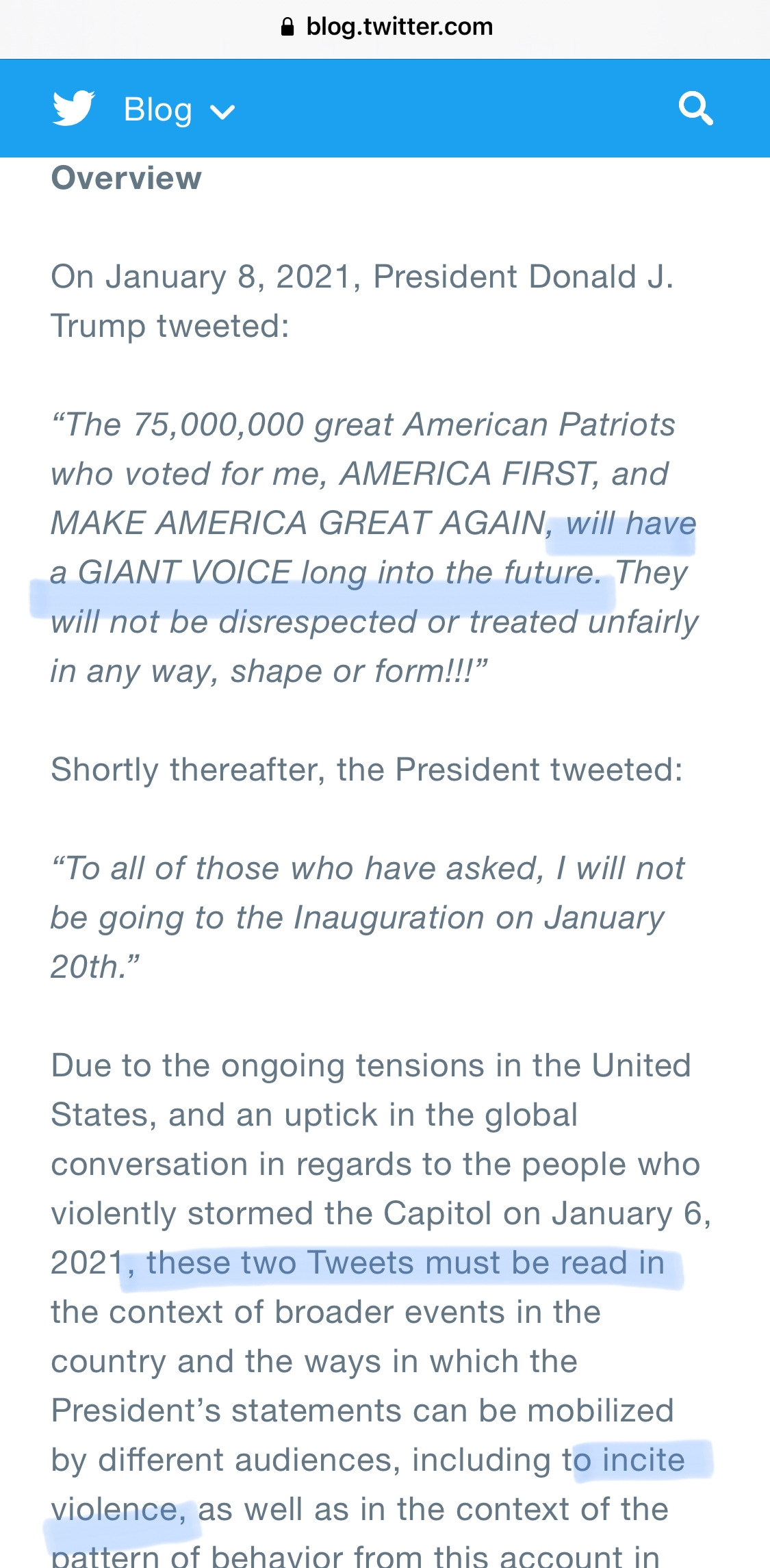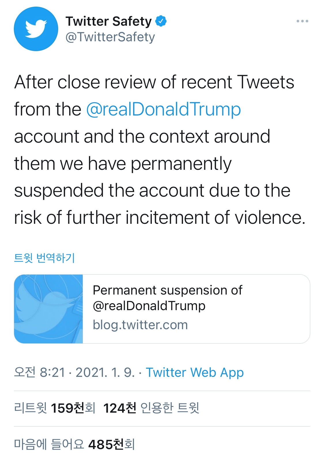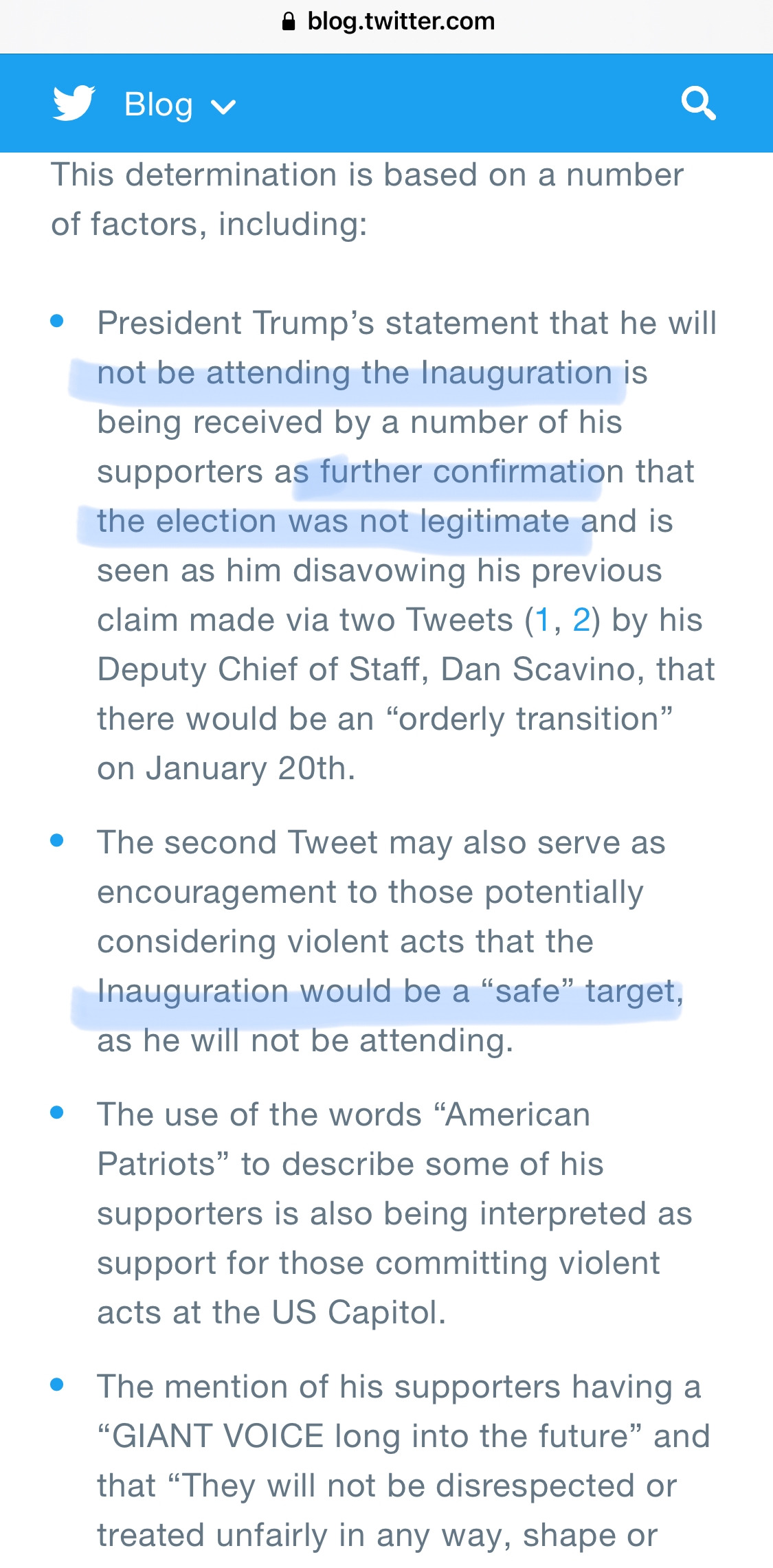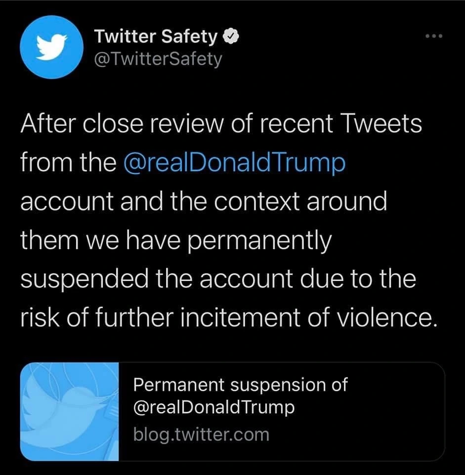 - 두 가지 트윗을 문제 삼았어요. 바이든 취임식 안 가겠다고 한게, 선거 부정 입장을 지지자들에게 공격 신호를 준거라 봤고요. '미국 애국자들' 표현 자체도 폭력 지지라고요. 미래의 거대한 목소리..어쩌고도 트통이 이긴 선거라 지지하는 이들에 대한 격려.