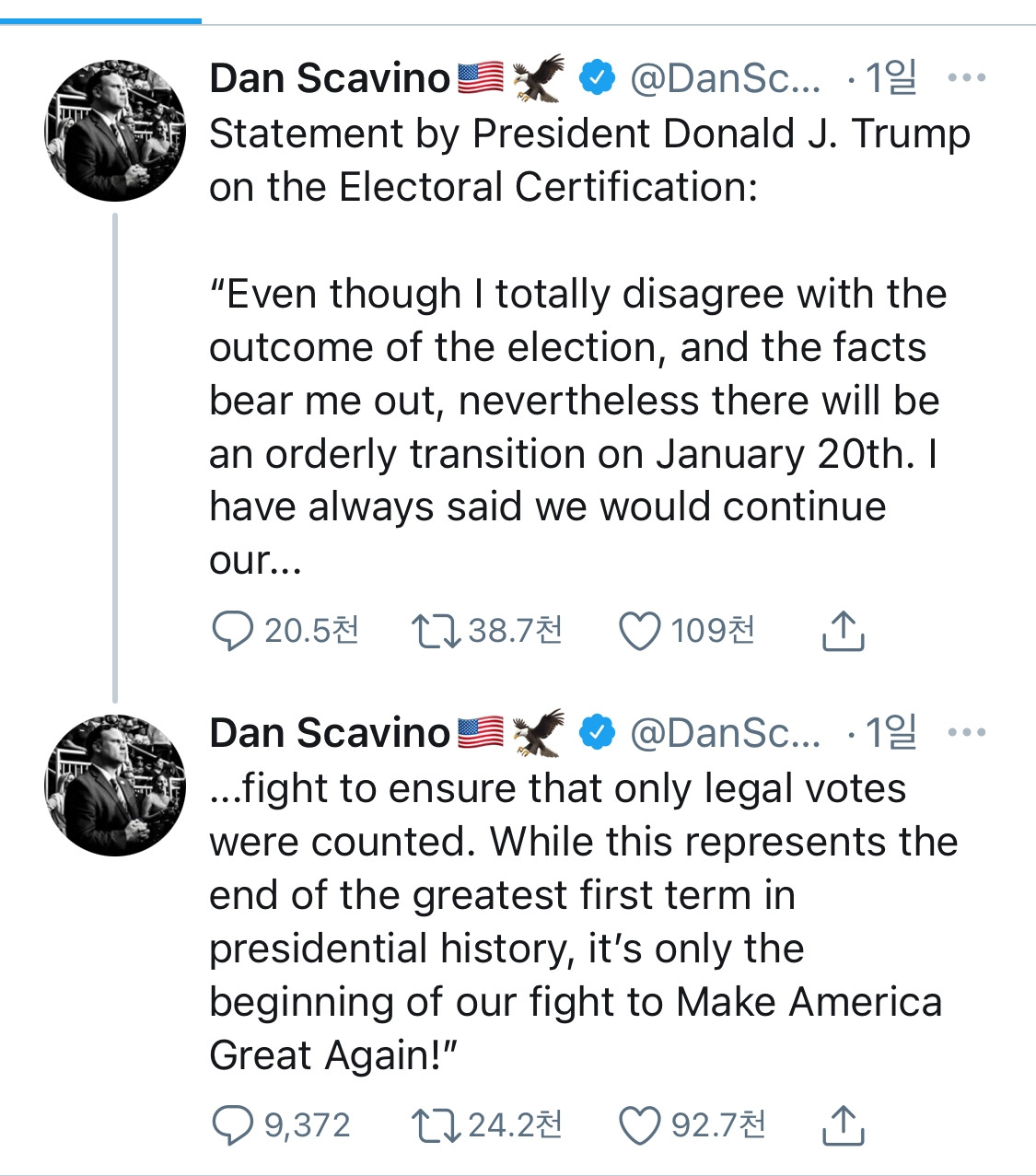 - 일단 백악관 공식 계정이 전날 간접적으로 트통 메시지를 리트윗했죠. 정권 이양은 질서 있게 이뤄지겠지만...선거 결과에 결코 동의않고, 싸움도 계속될 거란 메시지. 실제 트윗한 이는 댄 스캐비노 백악관 소셜미디어 국장.
