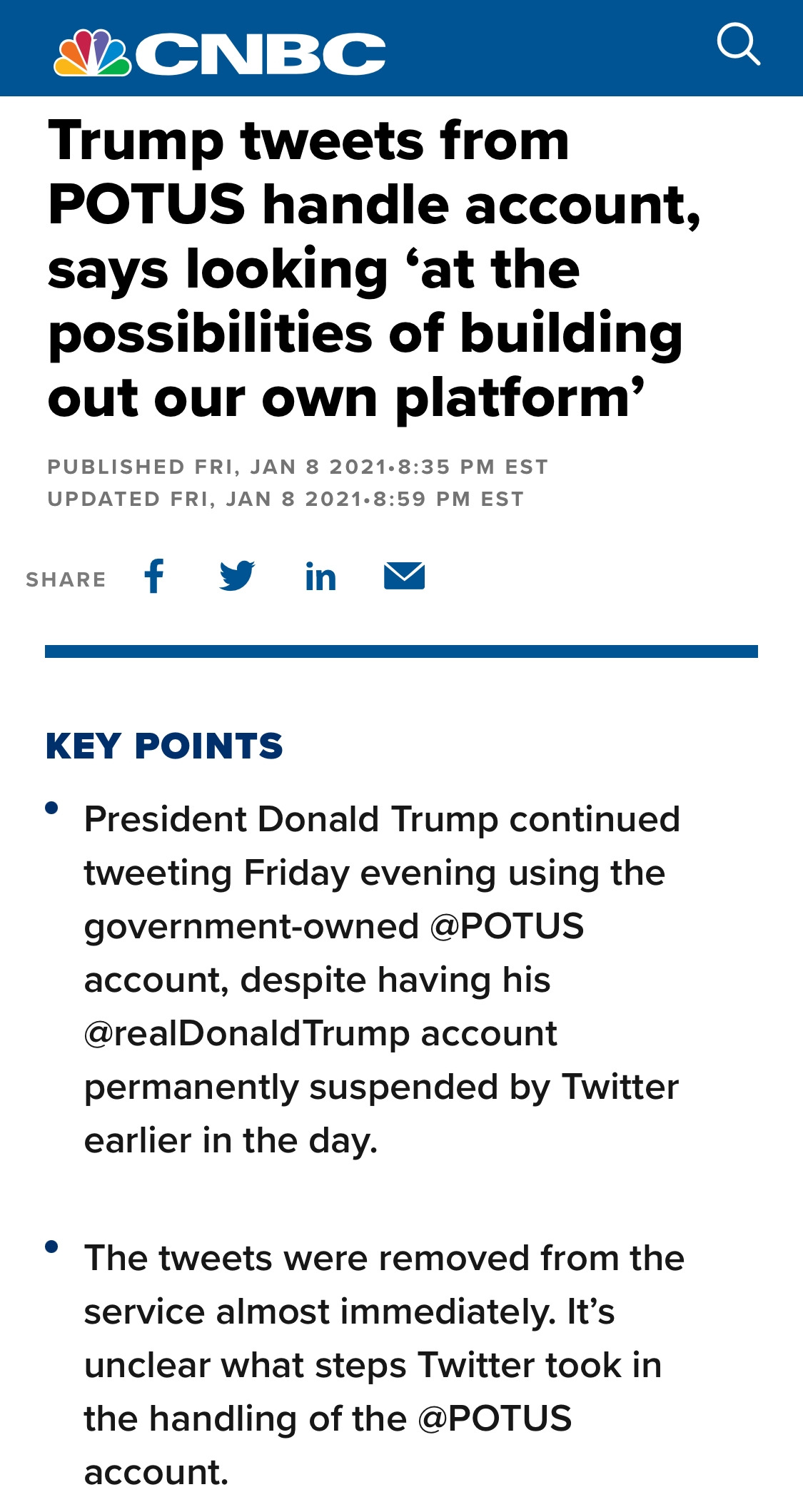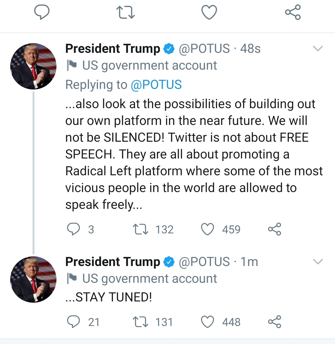 - 그럼 또 룰 위반이 가능하고, 트위터는 대응을 고민하겠죠. 이미 POTUS 계정 트윗도 삭제해서.. 다만 자연인 트럼프의 새 계정은 계속 조치하기 부담스러울 수 있습니다.