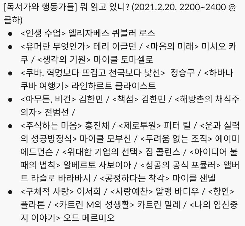 클럽하우스에서 토욜밤 두 시간 책수다. 이건 그야말로 제 휴식이자 취미생활 입니다. 몇 년 전부터 함께 책 수다 떨어보자고 했던 김태형 님과 드디어 합을 맞춰봤네요. 르네상스 지식인 태형님과 함께 #트레바리 #국경 모임 가진게 어언 4년차. 함께 읽은 책만 산술적으로 40권에 육박하지는 않고.. 제가 빼먹은게 많아서 그래도 한 30권에 달한다니, 우리 생각을 오래 나눈 꽤 친밀한 사이군요! 태형님의 독서 깊이는 도저히 따라갈 수 없지만 말입니다.