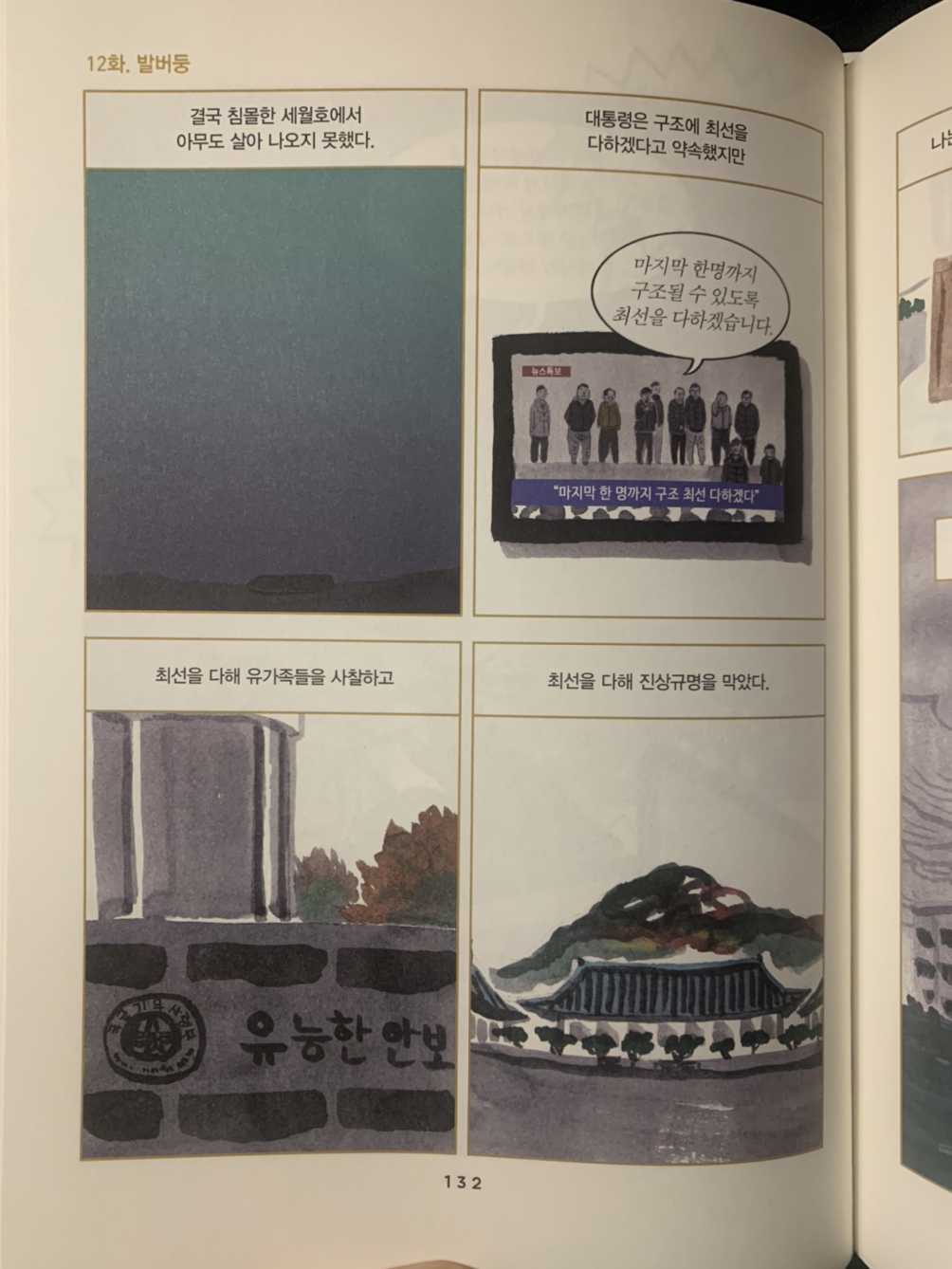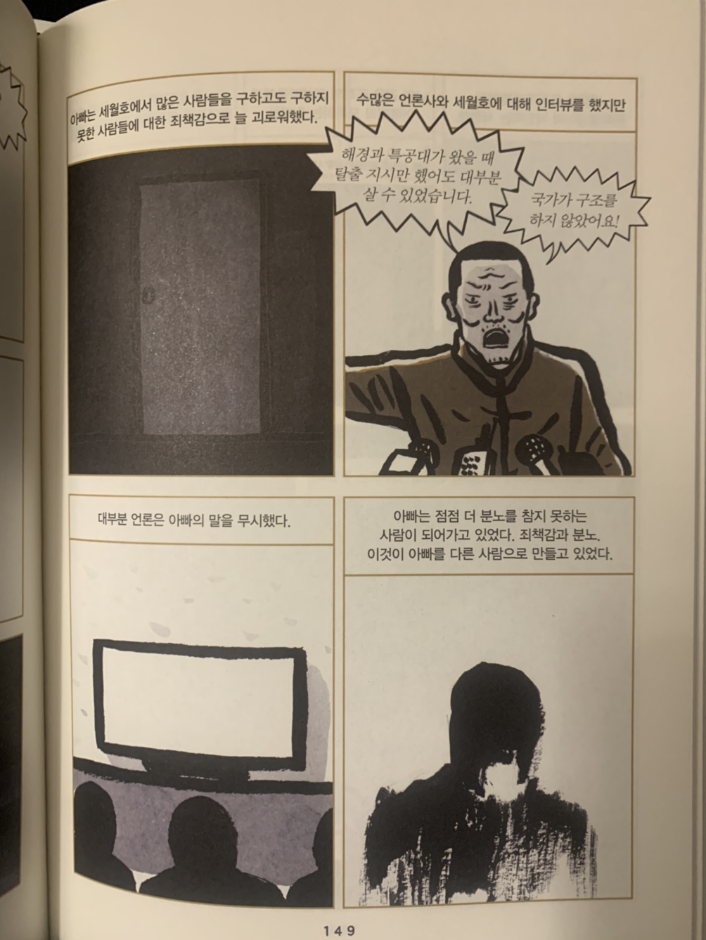 저의 오늘 선택은 <홀>. 부제는 '어느 세월호 생존자 이야기'입니다. 어제 책을 받고서, 잠시 멈칫했어요. 7년 전, 날마다 우는 것 외엔 할 수 있는게 없어서, 뉴스를 챙겨보던 날들이 떠올랐습니다. 같이 슬퍼하는 것 외엔 할게 없던 시절처럼, 이야기에서 눈을 떼지 않을 수 밖에 없잖아요. 세월호 참사 당시 많은 이들을 구했으나, 더 많이 구하지 못했다는 트라우마로 고통받았던 김동수 씨의 실화를 담은 그래픽노블입니다. 그의 가족을 만나고, 그의 이야기, 두 딸, 부인의 입장의 이야기를 같이 엮었어요. 뭐랄까, 글쓰고 그린 김홍모님도 그분의 이야기를 듣고, 나누는 것 외엔 할 수 있는게 없었나보다 싶어요. 기억하고, 같이 보는 것이 저로서는 최선이네요. 책이 출간되도록 도운 1000여명의 이름이 앞뒤 표지 안쪽에 빼곡합니다. 살아남은 자의 고통은 스스로 감당하지 못할 정도로 크고, 그를 바라보는 가족들의 고통도 결코 작지 않습니다.