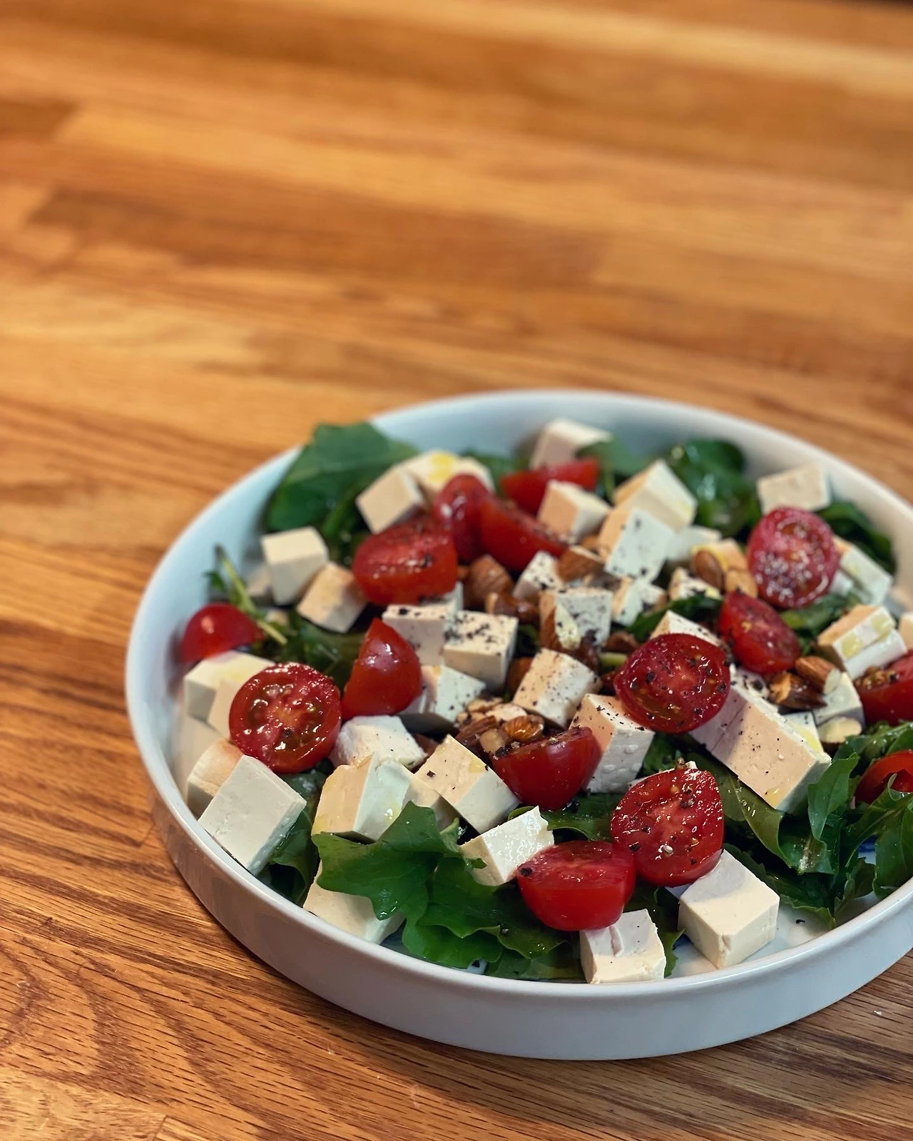 #소뿔농장 루꼴라 부자로서 방울토마토, 닭가슴살, 물기 뺀 꾸덕한 두부 등 토핑 바꿔가며 신났던 4월. 루꼴라 특유의 고소한 풍미가 좋아서 딱 소금후추 올리브오일만 더했다.