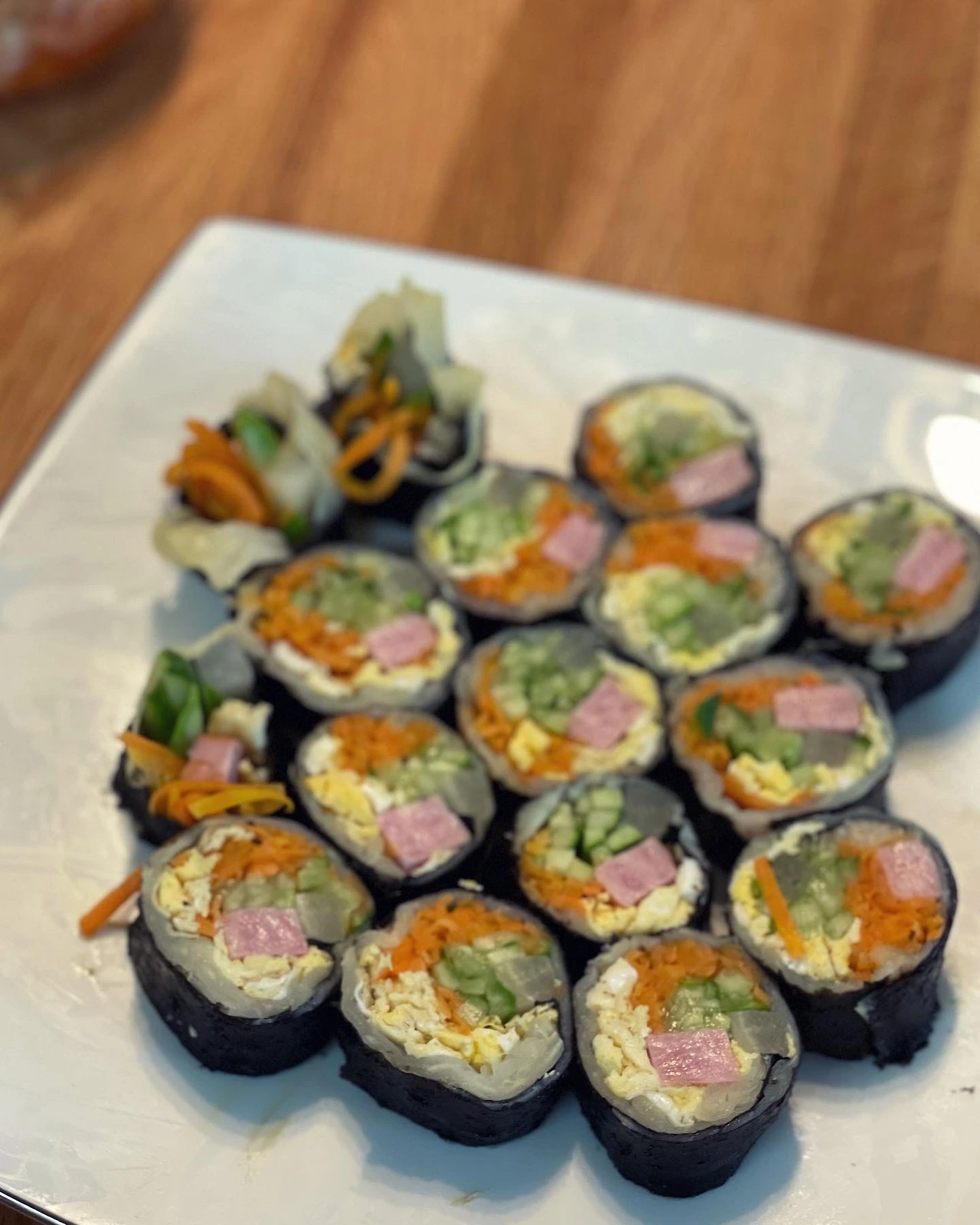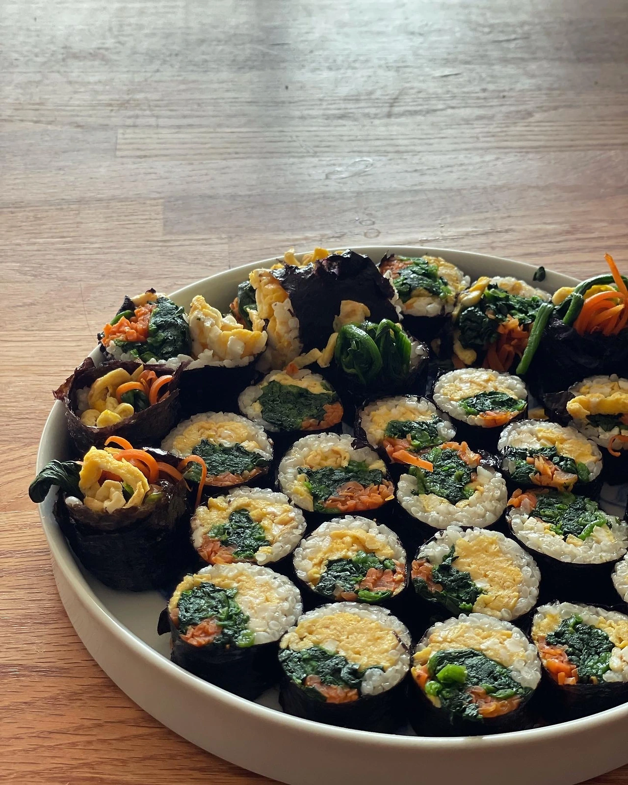 연휴 시작할 땐 찬밥 한 공기 남은 걸로 김밥 네 줄. 계란과 당근 시금치만 넣고 키토김밥이라 우겼어요. 밥이 워낙 적어서 모양도 별로고 옆구리 터졌다고 핑계댈 수 있어 좋아요. 김밥 마는 걸 목격한 옆지기는 라면을 끓였...