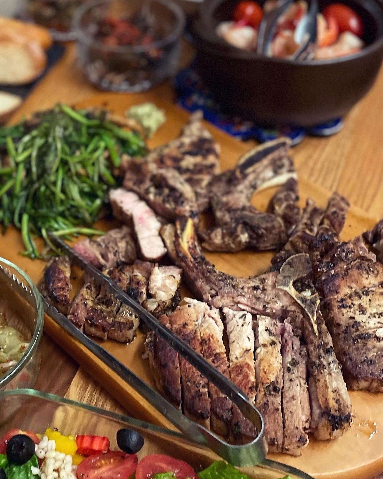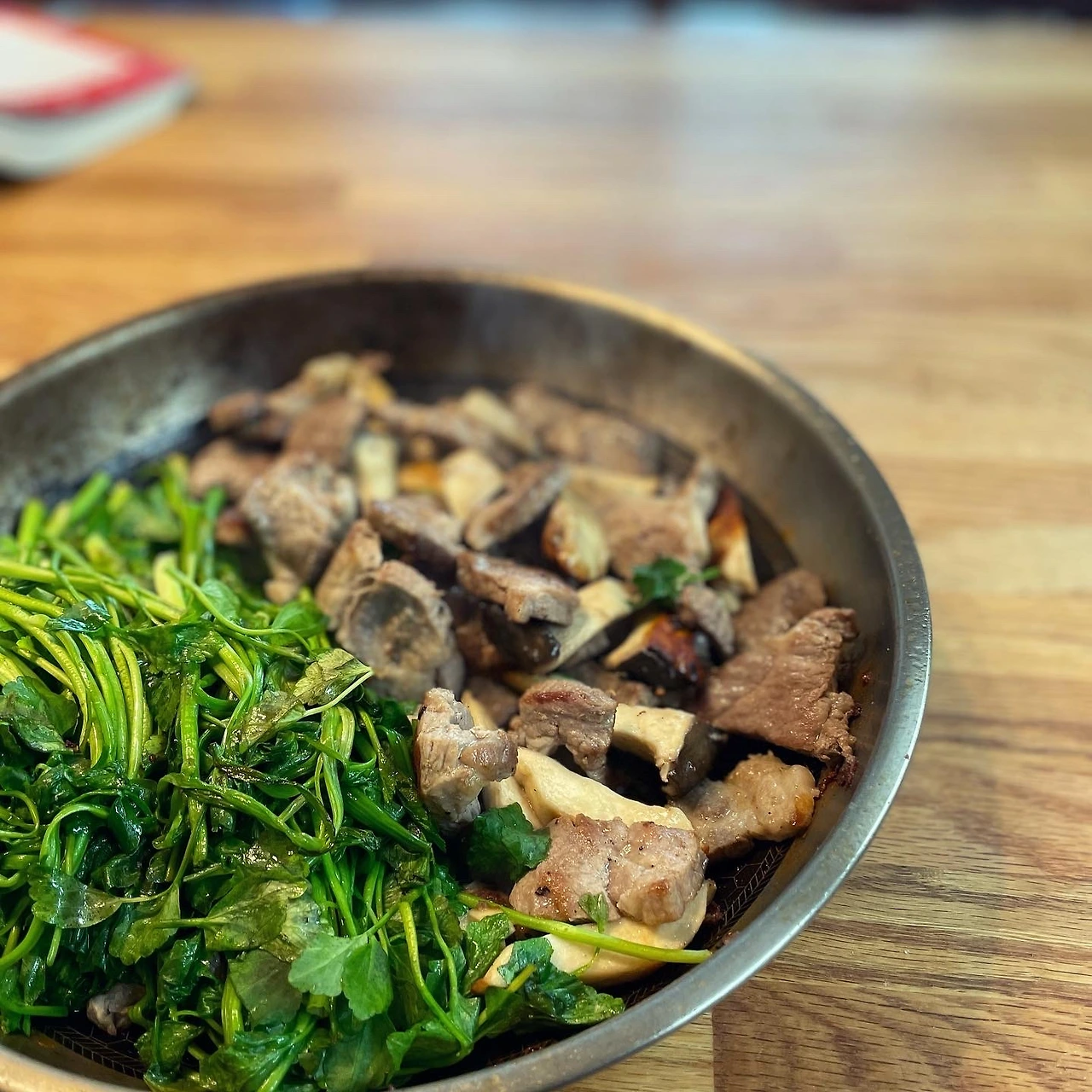 집콕 주간이라 돼지목살 구우며 미나리도 함께 올려보고.
