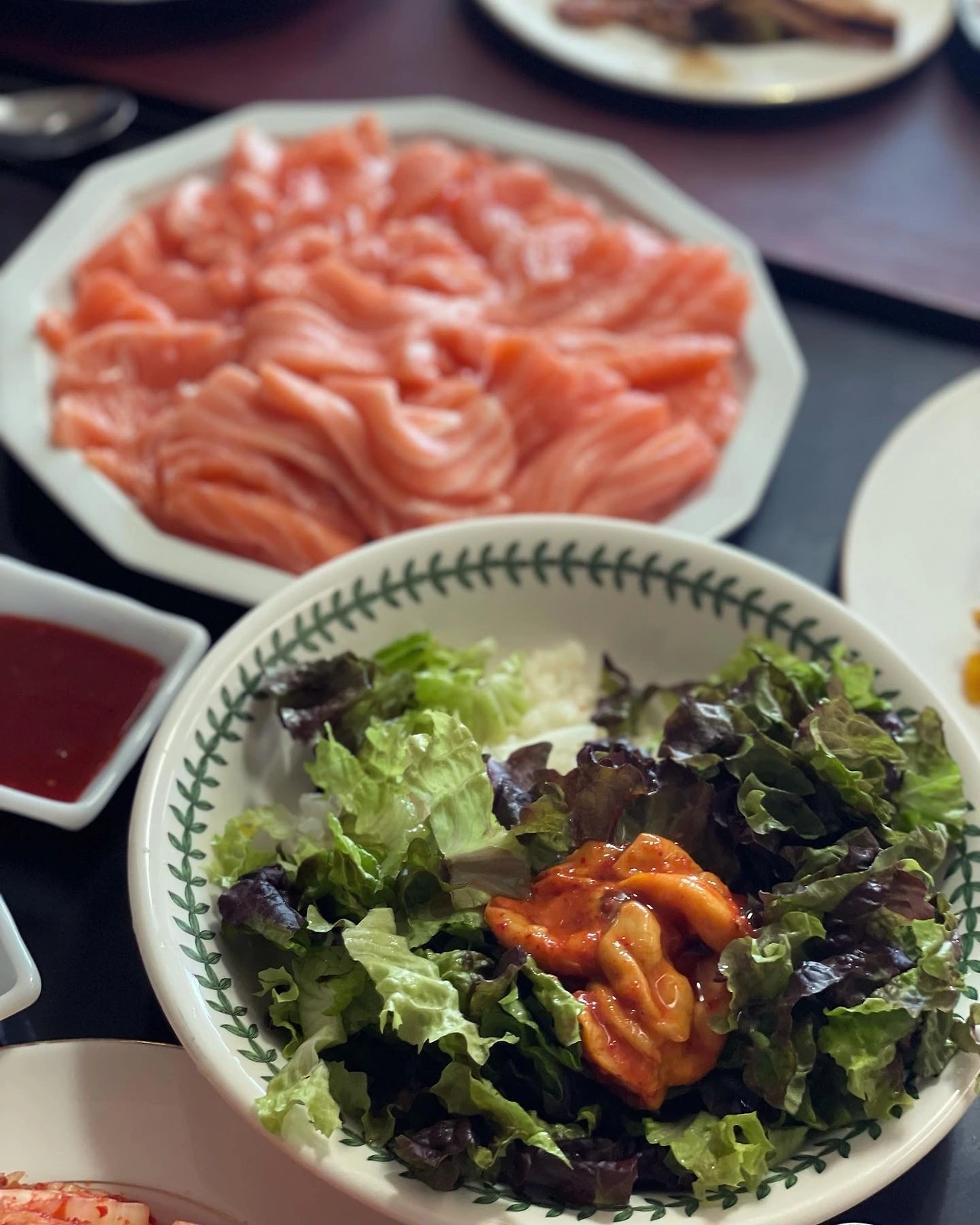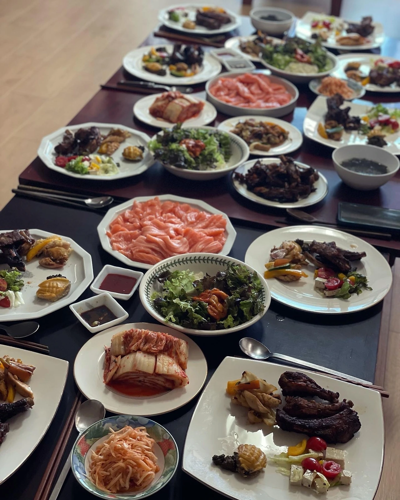큰 접시 보면서 양 부족한거 아니냐 묻길래 나 손 큰 여자다, 염려 말라고 한건 비빔밥까지 염두에 둔건데 인기가 없었고.. 대신 동생이 코슷코에서 사온 연어 한 판, 두 접시 가득 냈는데 깨끗하게 비웠다. 멍게젓도 못먹는 애들이 어째 연어 킬러다.