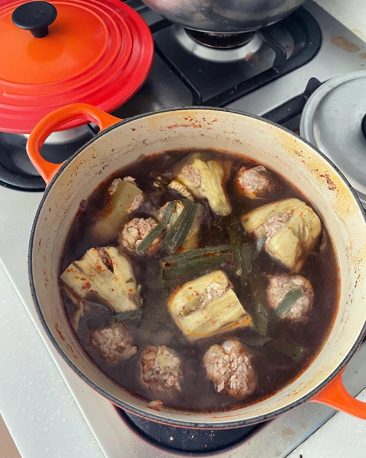 - 물붓고 끓였어요. 벗긴 가지껍질 아까워서 넣었더니 색깔은 거무튀튀하지만 괜찮고요. 대파 넉넉히+마늘 추가.