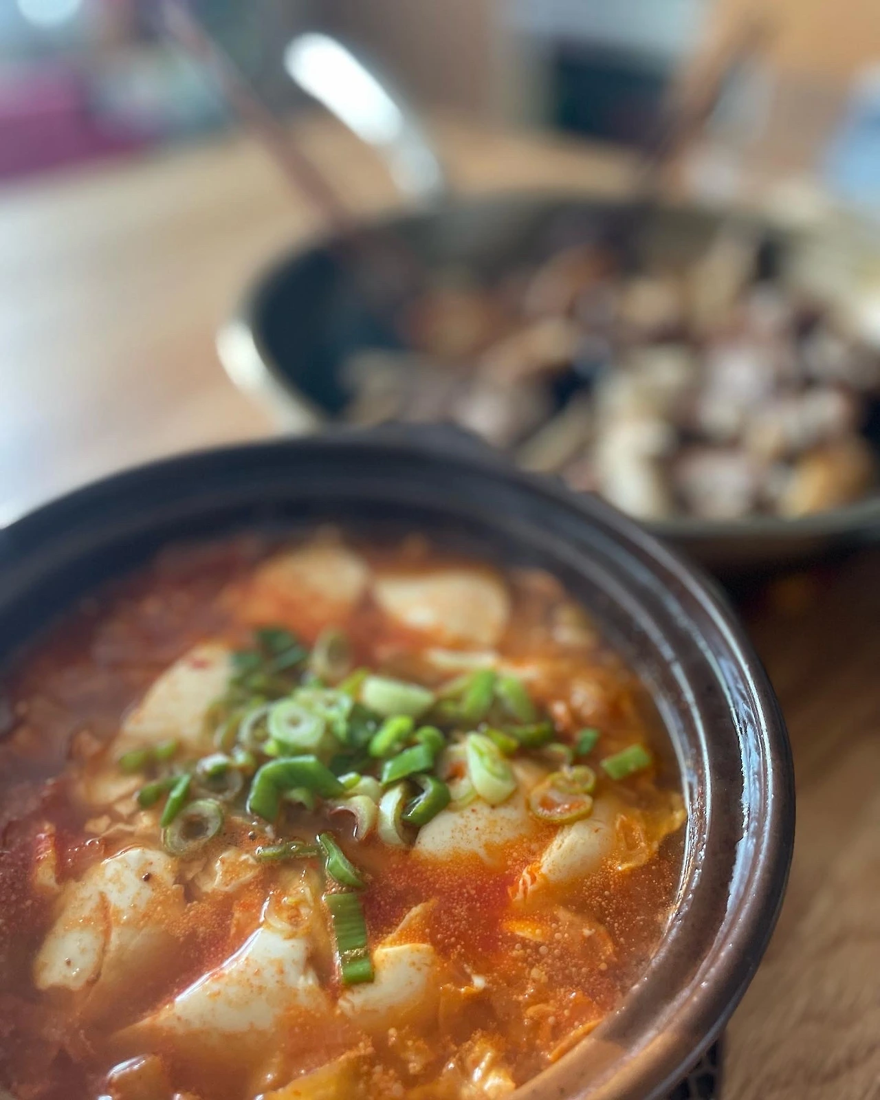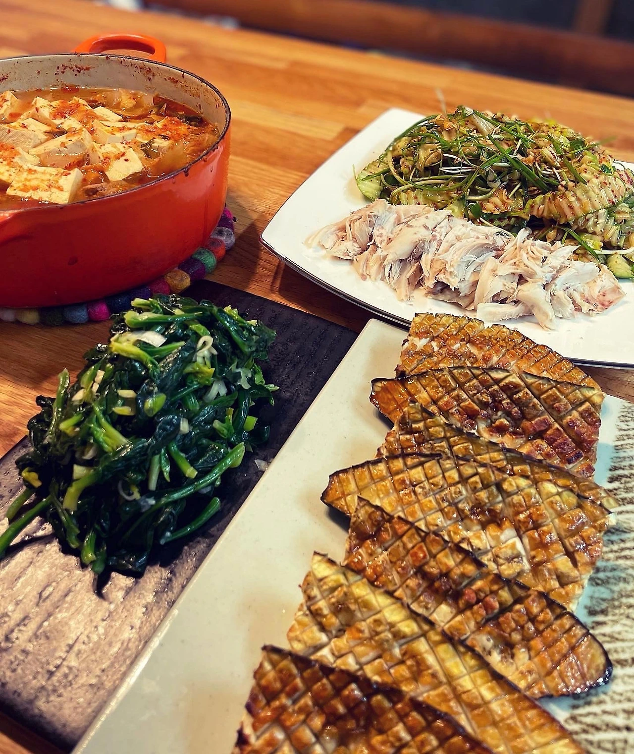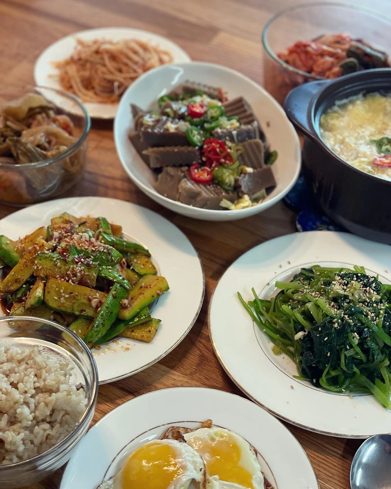 애호박은 팬에 살캉하게 익혀 양념장에 무쳤다. 고소한 참나물에 묵무침, 순두부찌개, 청란 프라이, 들기름에 쪄낸 김치찜..신경쓴 #마냐밥상. 마음 가는대로 응원밥상이다.