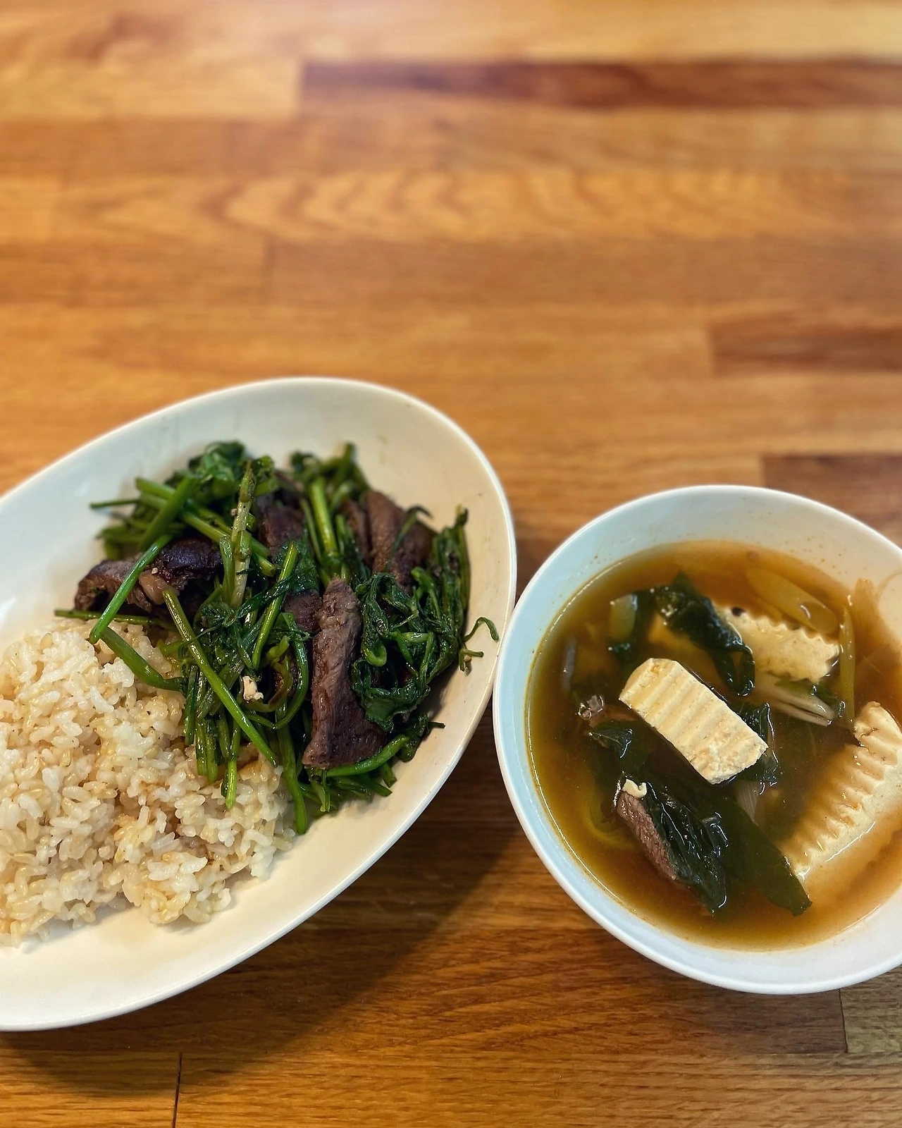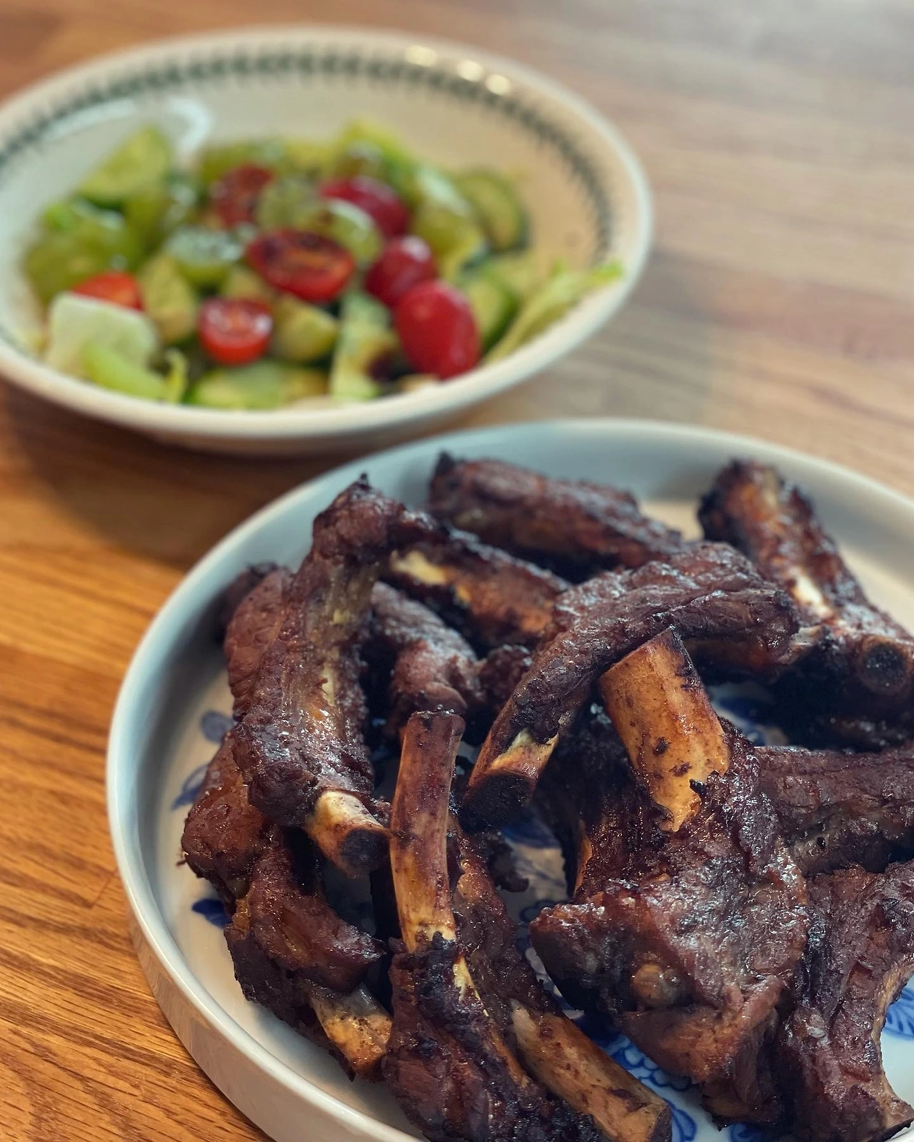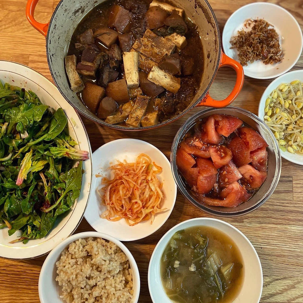 그가 격리를 마치고 돌아온 날 밥상은 멸치다시마육수 진하게 낸 배추된장국과 새콤달콤 섬초무침. 시들어가는 토마토는 데친후 껍질벗겨 메이플시럽발사믹올리브유 퐁당. 애들이 먹다남은 갈비찜엔 야채만 남았길래 물기뺀 두부 추가.