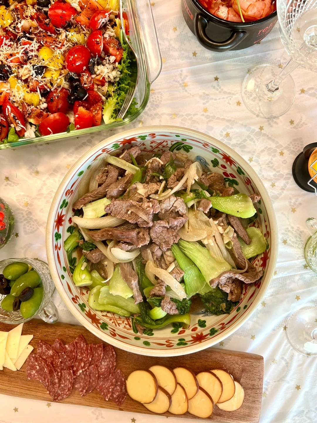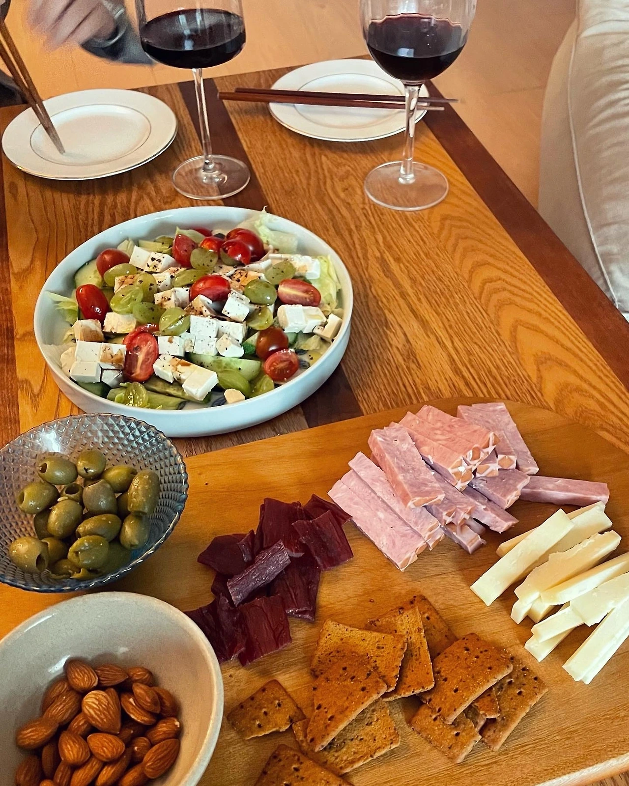 더할나위 없이 유쾌했던 티타임을 마치고 2차 어디갈까 하다 우리집이라니. 알고보니 옆지기가 궁금했던 Y님. 손님들 거실에 10분만 기다리라 하고 휘리릭 차려낸 마냐안주상. 햄 치즈 올리브 비스켓 아몬드가 마침 다 있던 날. 두부 샐러드까지 흠흠.