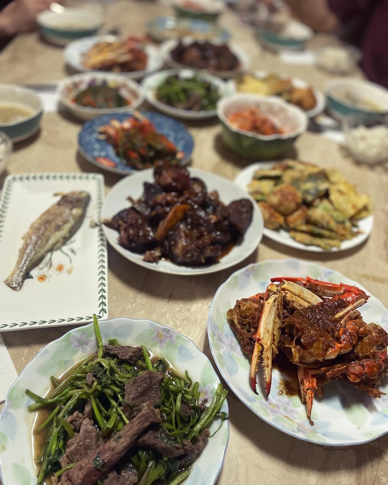 전날 시엄니와 함께 하던 노동도 처음 생략했다. 집에서 혼자 갈비 기름 떼고, 칼집 넣고, 핏물 뺀뒤 오래 푹 고왔다. 하룻밤 냉장고에서 굳은 기름을 걷어내면 끝. 굴비는 꼬리 지느러미 떼고 비늘 벗겨 준비했고, 준비와 조리에 10분 걸리는 미나리고기볶음 재료도 챙겨서 아침 일찍 출동했다. 시엄니는 토란국을 끓이고 꽃게찜을 하셨다. 차례상 아니라도 상다리 휘어져라 차리는 시엄니의 명절 리추얼은 팔순 넘겨 봄에 고관절 골절 수술까지 하신 뒤에야 바뀐 셈이다.