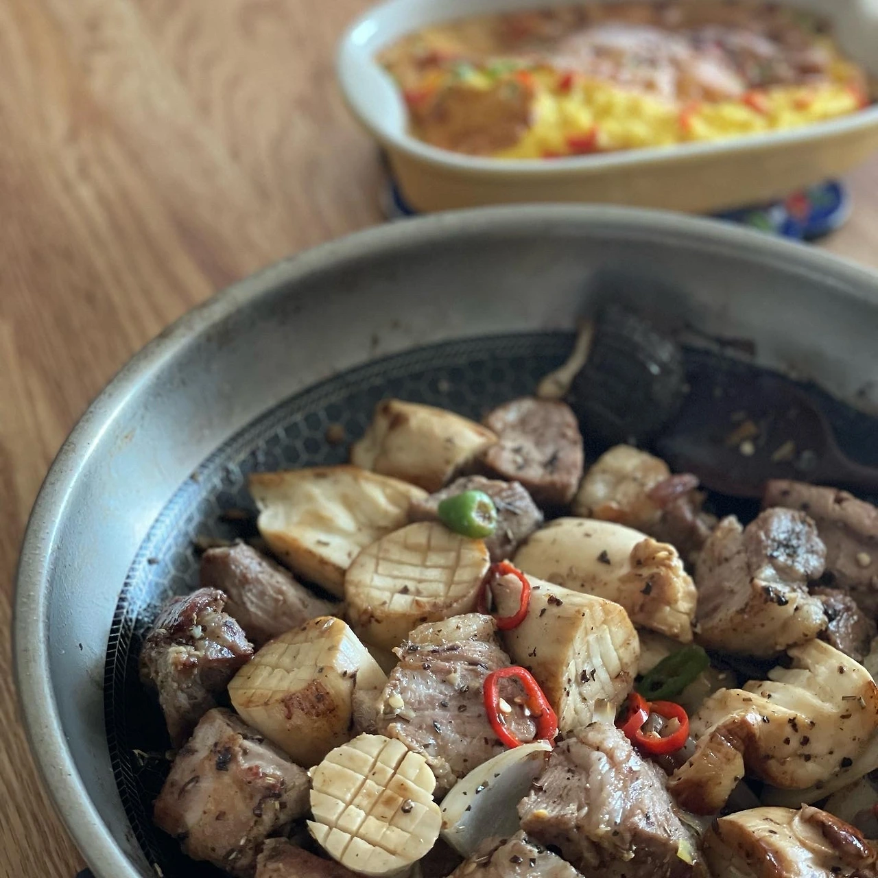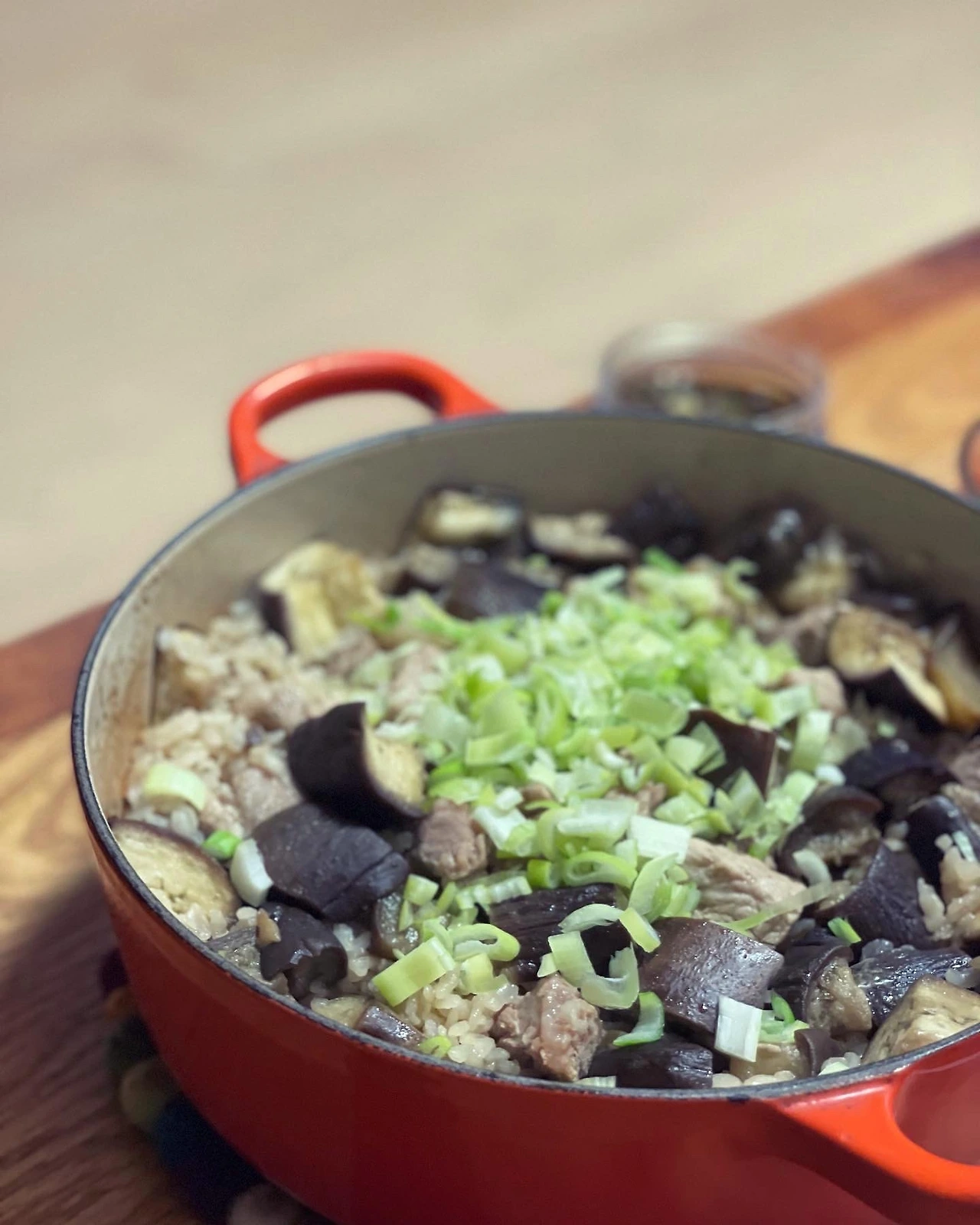 돼지고기와 가지를 간장액젓에 볶다가 불린 쌀 넣고 가지솥밥. 이런 날은 탄수화물 자제 불가.
