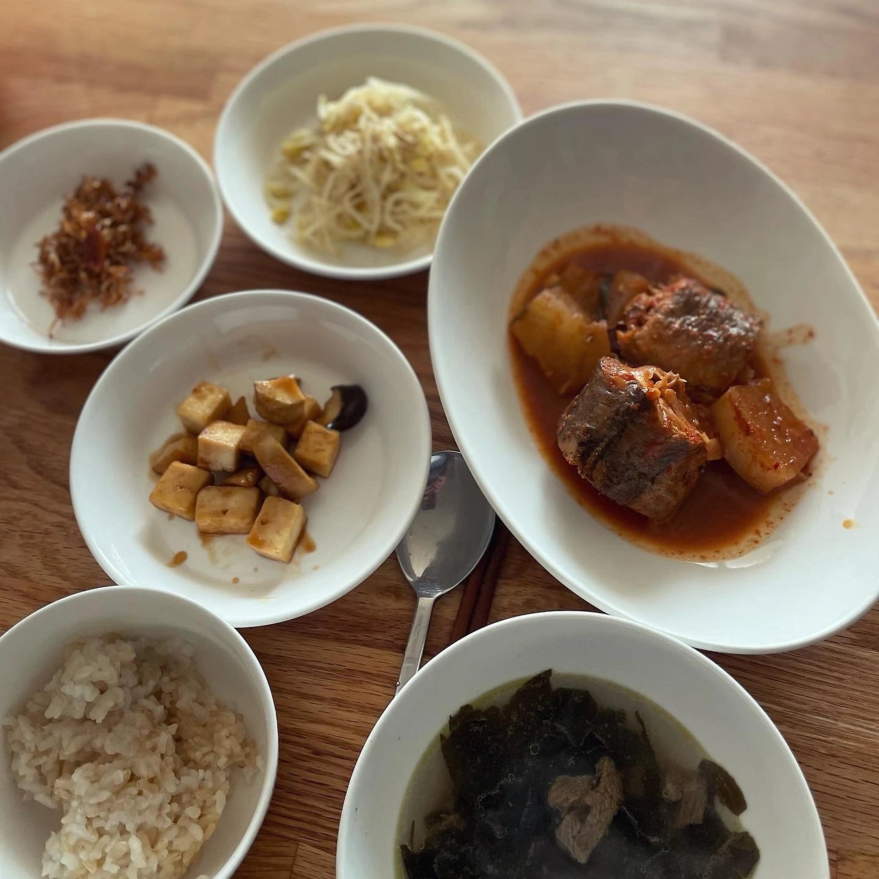 내 목이 아프던 날, 호로록 먹고 싶어 진한 쇠고기미역국을 끓였고, 코다리조림에 도전했는데 매콤달큰하게 졸인 무가 너무 맛나서 자뻑. 두부프레스로 쫀쫀해진 두부는 들기름에 버섯과 볶아도 좋다.