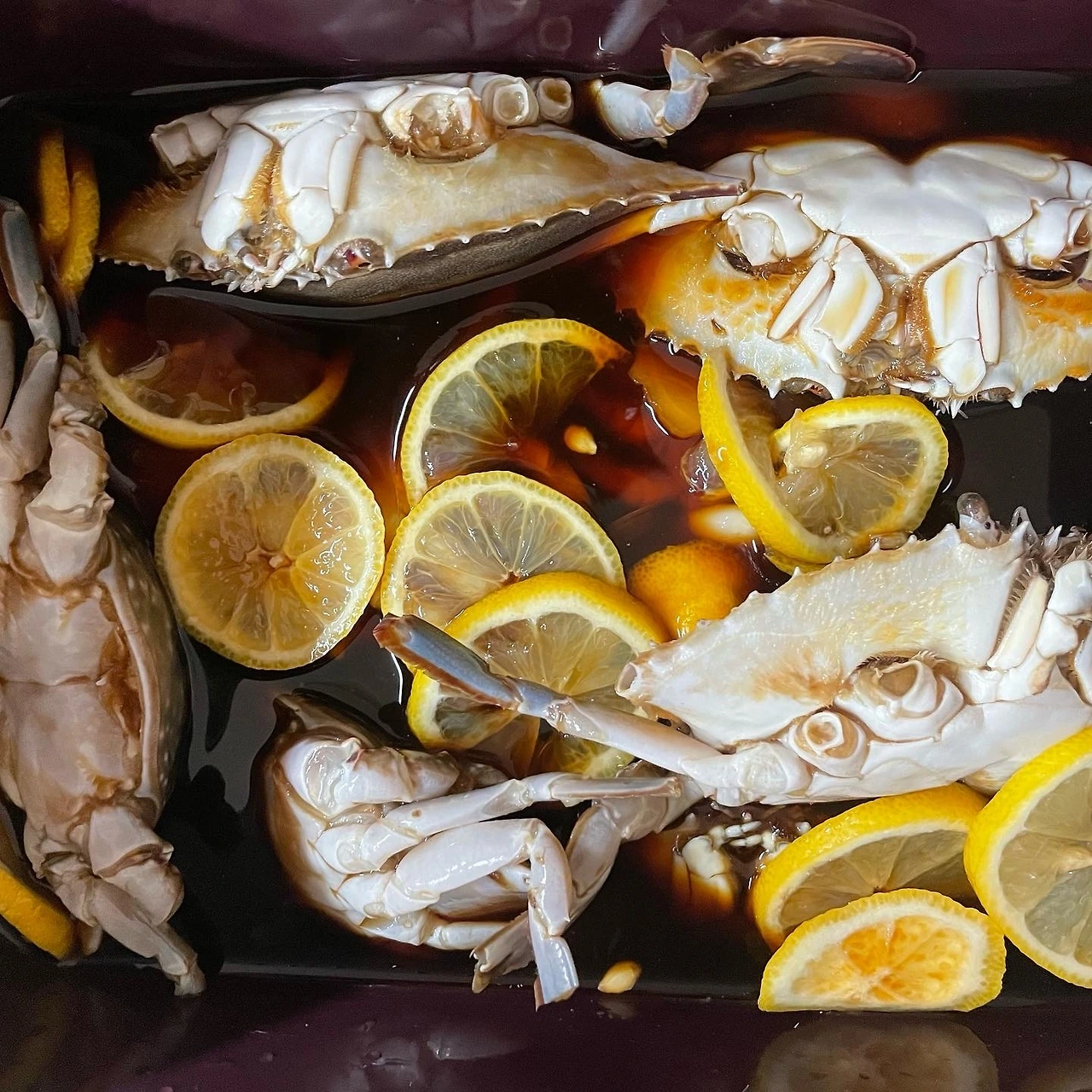 급기야 간장게장에 도전했다. 인어교주해적단 할인광고에 또 당했다. 냉동이면 어떤가. 다리 떨어진 몽당이면 어떤가. 알배기 암꽃게 2kg 45,900원. 어지간한 식당 1인분 가격에 열두마리를 얻고 의기양양. 전용 간장을 넘 적게 주문한 탓에 결국 황금레시피를 검색해 간장3컵 소주사이다 각1컵1 설탕 1/2컵 끓여 식히고, 고추 생강 마늘 레몬 투척. 생각보다 간단했고, 맛은 훌륭했다. 식당처럼 예쁘게 차리는 건 실패. 내가 그것까지 잘하면 좀 사기 아닐까.