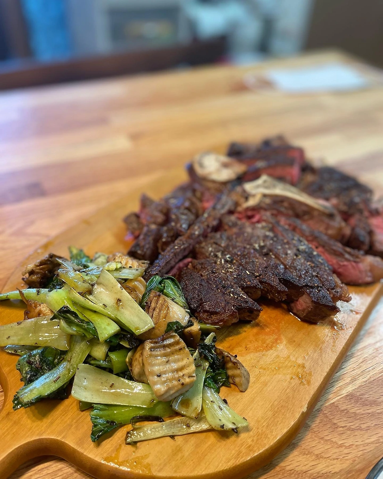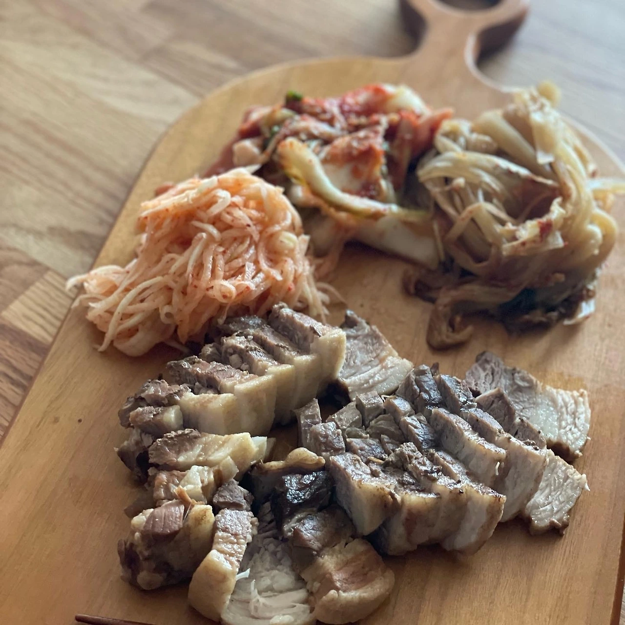 단백질 집중하는 둘째를 위해 수육. 무생채에 시엄니 겉절이, 묵은지는 씻어서 들기름에 익혔다. 두툼 목살을 두툼 버섯과 버터에 구웠다.