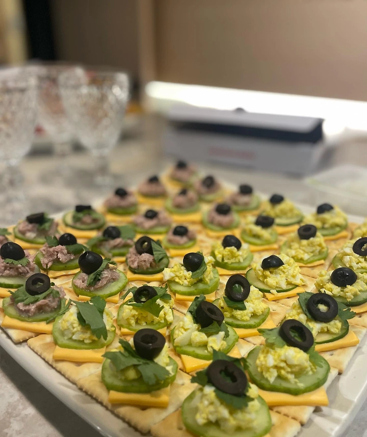 쉬운 메뉴만 찾다가 카나페. 양파다져 물에 담궈 아린맛 빼고 물기 빼고 참치와..그리고 계란다진거..둘다 마요네즈. 고수와 올리브 토핑. 할만하다.